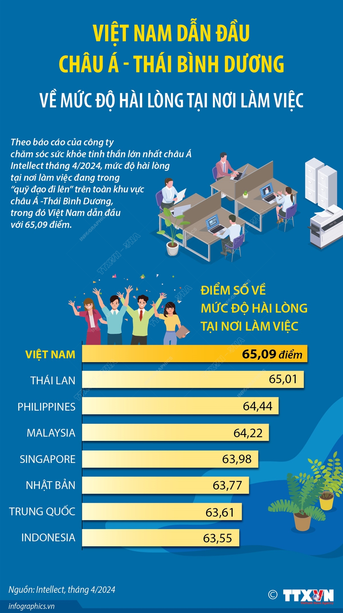 Theo báo cáo của công ty chăm sóc sức khỏe tinh thần lớn nhất châu Á Intellect tháng 4/2024, mức độ hài lòng tại nơi làm việc đang trong “quỹ đạo đi lên” trên toàn khu vực châu Á -Thái Bình Dương, trong đó Việt Nam dẫn đầu với 65,09 điểm.