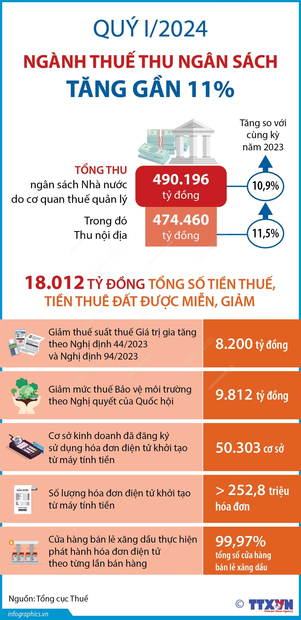 Theo Tổng cục Thuế, trong quý I/2024, tổng thu ngân sách Nhà nước do cơ quan thuế quản lý ước đạt 490.196 tỷ đồng, bằng 33% so với dự toán năm 2024, tăng 10,9% so với cùng kỳ năm 2023. Trong số đó, thu nội địa ước đạt 474.460 tỷ đồng, bằng 32,9% dự toán năm 2024, tăng 11,5% so với cùng kỳ năm 2023.