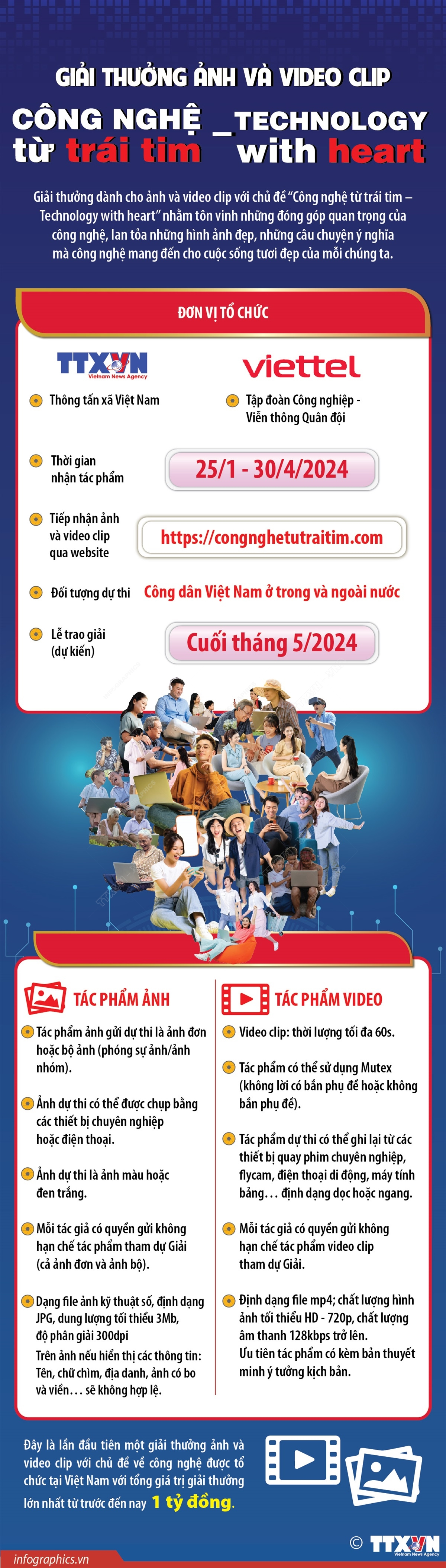 Giải thưởng dành cho ảnh và video clip với chủ đề “Công nghệ từ trái tim – Technology with heart” do Thông tấn xã Việt Nam (TTXVN) phối hợp với Tập đoàn Công nghiệp – Viễn thông Quân đội (Viettel) tổ chức nhằm mục đích tôn vinh những đóng góp quan trọng của công nghệ, lan tỏa những hình ảnh đẹp, những câu chuyện ý nghĩa mà công nghệ mang đến cho cuộc sống tươi đẹp của mỗi chúng ta. Thời gian nhận tác phẩm dự thi là từ 25/1/2024 đến hết ngày 30/4/2024. Đối tượng dự thi là công dân Việt Nam ở trong và ngoài nước. Dự kiến lễ tổng kết và trao giải tổ chức vào cuối tháng 5/2024. Ban Tổ chức sẽ trao 03 giải Nhất, mỗi giải 50 triệu đồng (1 giải cho ảnh đơn, 1 ảnh bộ, 1 video clip); 06 giải Nhì, mỗi giải 40 triệu đồng; 09 giải Ba, mỗi giải 30 triệu đồng; 15 giải Khuyến khích, mỗi giải 10 triệu đồng. Tác giả gửi trực tiếp qua phần "Đăng ký dự thi" trên website: https://congnghetutraitim.com...