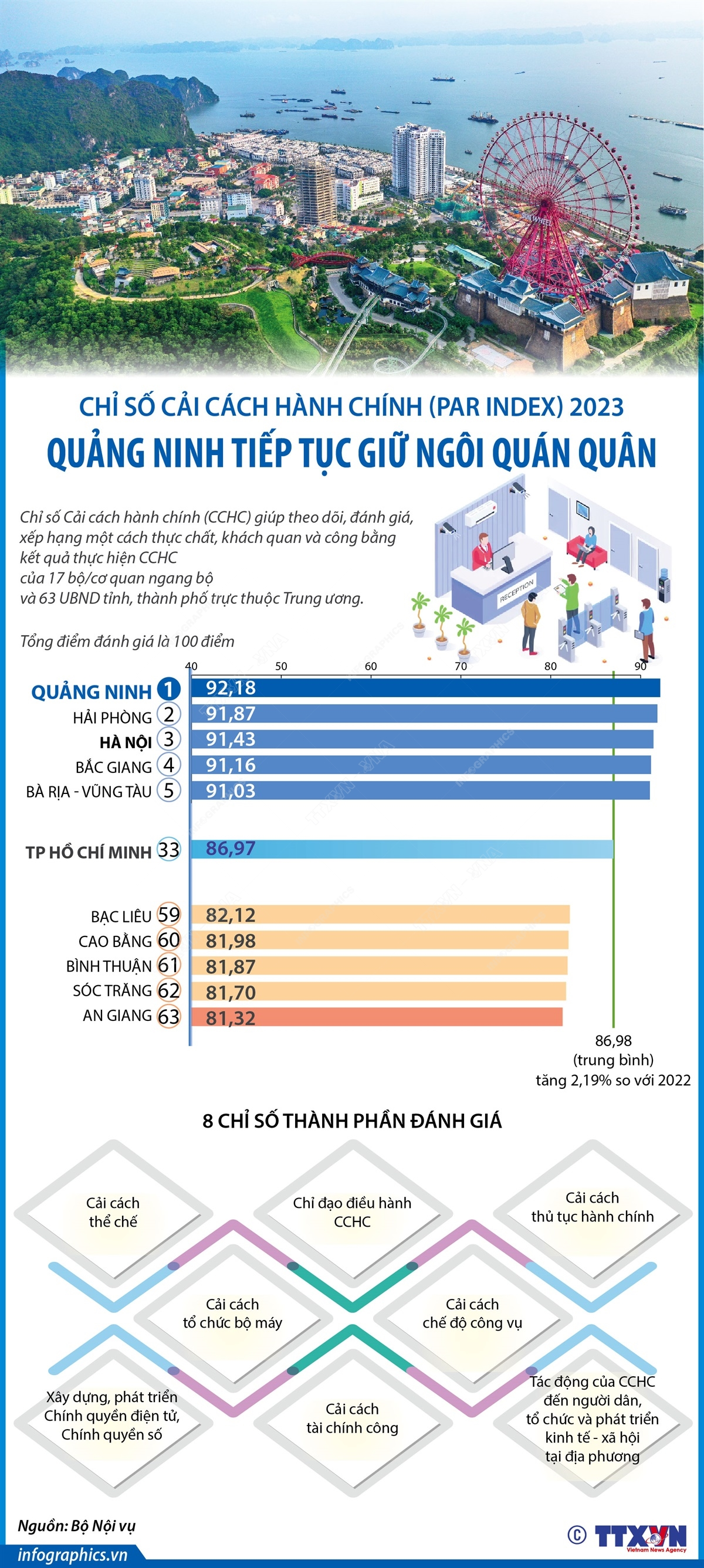 Kết quả Chỉ số Cải cách hành chính 2023 (PAR INDEX 2023) mà các địa phương đạt được là khá toàn diện trên tất cả các lĩnh vực. Theo đánh giá, PAR INDEX của các tỉnh, thành phố đã trở lại quỹ đạo tăng trưởng tích cực, giá trị trung bình năm 2023 đạt 86,98%, cao hơn 2,19% so với năm 2022. Đây là lần thứ 5 liên tiếp, PAR INDEX của các địa phương đạt giá trị trung bình trên 80%. Năm 2023, tỉnh Quảng Ninh tiếp tục dẫn đầu bảng xếp hạng với kết quả đạt 92,18%. Từ năm 2012 đến nay, Quảng Ninh có 6 lần đứng đầu bảng xếp hạng PAR INDEX cả nước.