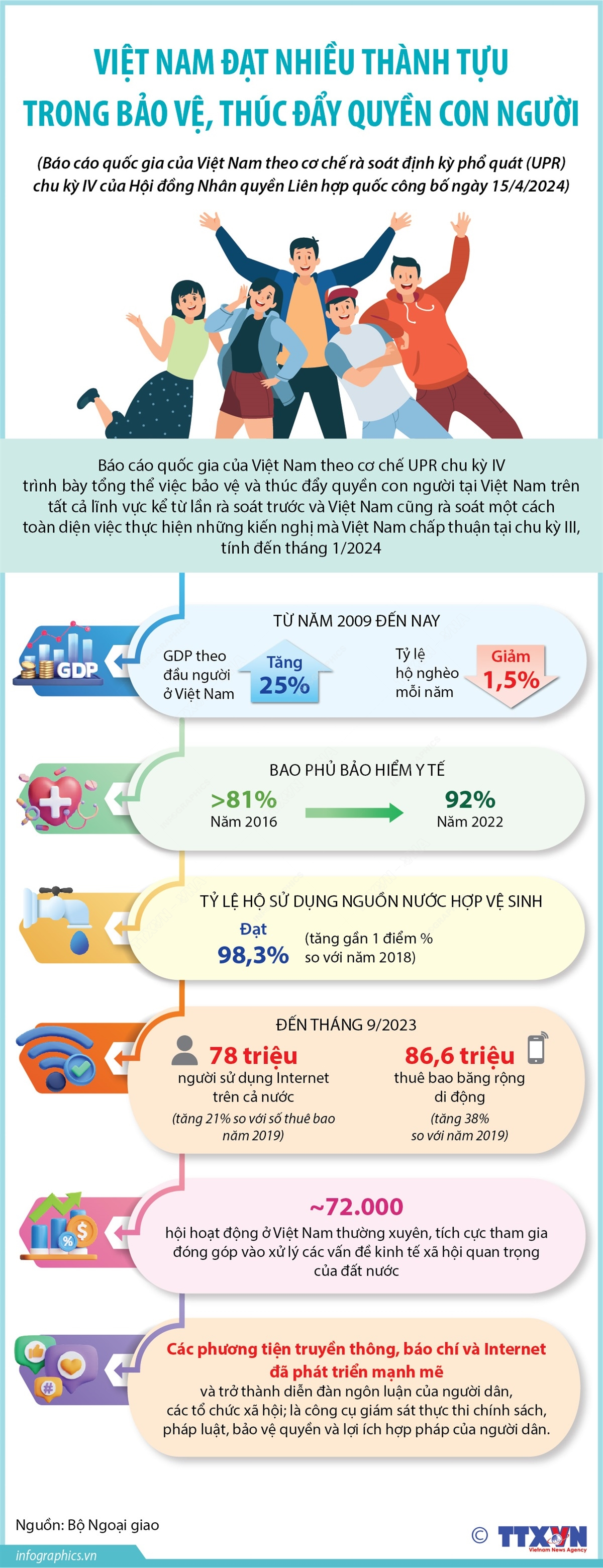 Báo cáo quốc gia của Việt Nam theo cơ chế rà soát định kỳ phổ quát (UPR) chu kỳ IV của Hội đồng Nhân quyền Liên hợp quốc được Bộ Ngoại giao Việt Nam công bố ngày 15/4/2024. Theo đó, báo cáo cung cấp tình hình cập nhật với những dẫn chứng, thông tin và số liệu cụ thể, qua đó khẳng định nỗ lực rất lớn của Việt Nam trong bảo đảm quyền con người, nhất là trong hoàn thiện hệ thống pháp luật về quyền con người, thực hiện nghĩa vụ theo các điều ước quốc tế về quyền con người mà Việt Nam là thành viên, những thành tựu của Việt Nam về giảm nghèo đa chiều bền vững, đảm bảo an sinh xã hội, nâng cao đời sống của người dân, bảo đảm quyền của các nhóm dễ bị tổn thương; việc Việt Nam tham gia đối thoại với các đối tác quốc tế, khu vực trong lĩnh vực quyền con người. Toàn văn báo cáo bằng tiếng Anh và tiếng Việt đã được đăng trên trang web của Bộ Ngoại giao.