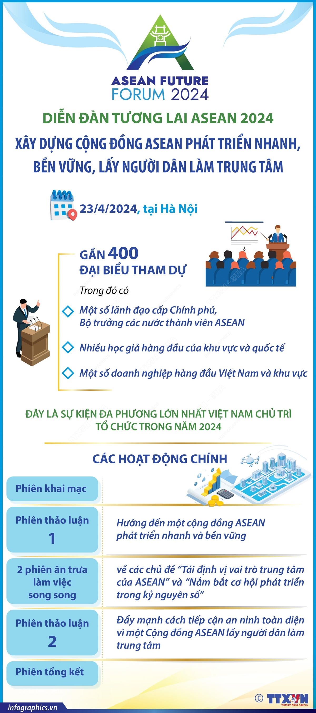 Diễn đàn Tương lai ASEAN 2024 (ASEAN Future Forum - AFF 2024) diễn ra vào ngày 23/4/2024 tại Hà Nội, với sự tham dự của gần 400 đại biểu, gồm lãnh đạo cấp cao của một số nước ASEAN và đối tác, đại diện các tổ chức quốc tế và các học giả hàng đầu khu vực và thế giới. Sáng kiến tổ chức Diễn đàn Tương lai ASEAN được Thủ tướng Chính phủ Phạm Minh Chính công bố tại Hội nghị Cấp cao ASEAN lần thứ 43 (Jakarta, Indonesia, tháng 9/2023). Đây là ý tưởng mới của Việt Nam với mong muốn tạo ra một diễn đàn để cùng các nước thành viên, các bạn bè, đối tác của ASEAN và các tầng lớp người dân ASEAN đóng góp vào thúc đẩy định hình con đường phát triển tương lai cho ASEAN.