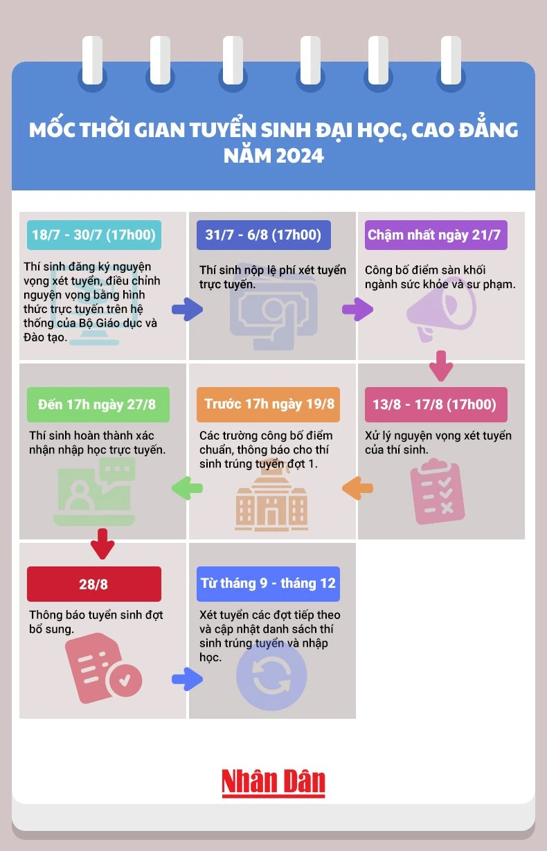 Năm nay, thí sinh bắt đầu tiến hành đăng ký nguyện vọng xét tuyển để tuyển sinh vào các trường đại học, cao đẳng từ thời điểm giữa tháng 7. Dưới đây là các mốc thời gian thí sinh cần ghi nhớ trong kỳ tuyển sinh đại học, tuyển sinh cao đẳng ngành giáo dục mầm non năm 2024.