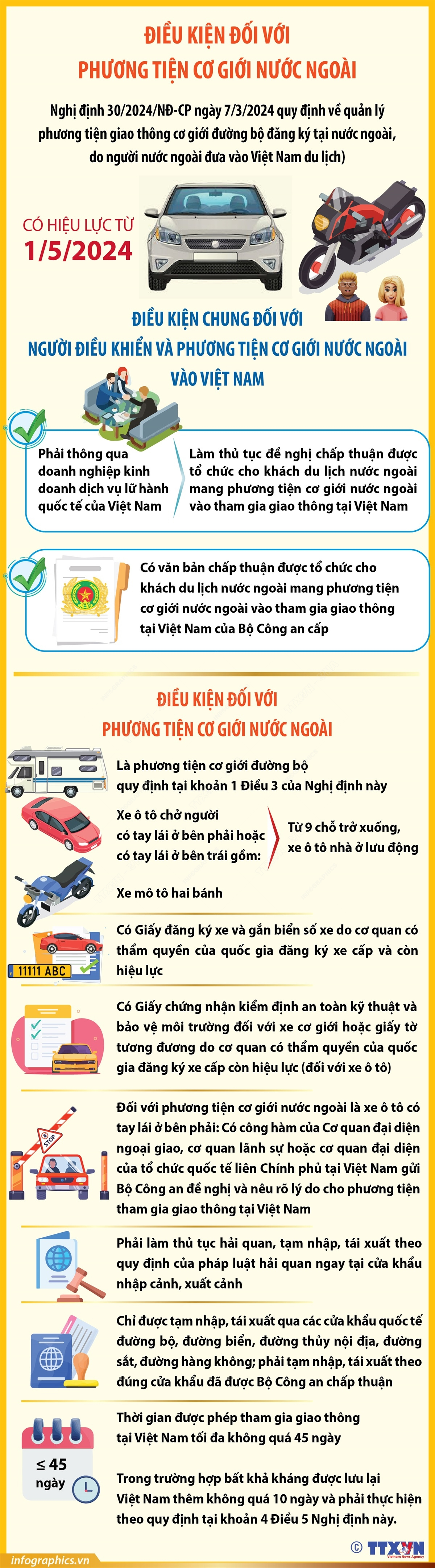 Theo Nghị định 30/2024/NĐ-CP ngày 7/3/2024 quy định về quản lý phương tiện giao thông cơ giới đường bộ đăng ký tại nước ngoài, do người nước ngoài đưa vào Việt Nam du lịch, từ ngày 1/5/2024, phương tiện cơ giới nước ngoài vào tham gia giao thông tại Việt Nam phải có Giấy đăng ký xe và gắn biển số xe do cơ quan có thẩm quyền của quốc gia đăng ký xe cấp và còn hiệu lực; Có Giấy chứng nhận kiểm định an toàn kỹ thuật và bảo vệ môi trường đối với xe cơ giới hoặc giấy tờ tương đương do cơ quan có thẩm quyền của quốc gia đăng ký xe cấp còn hiệu lực (đối với xe ô tô); Phải làm thủ tục hải quan, tạm nhập, tái xuất theo quy định của pháp luật hải quan ngay tại cửa khẩu nhập cảnh, xuất cảnh…