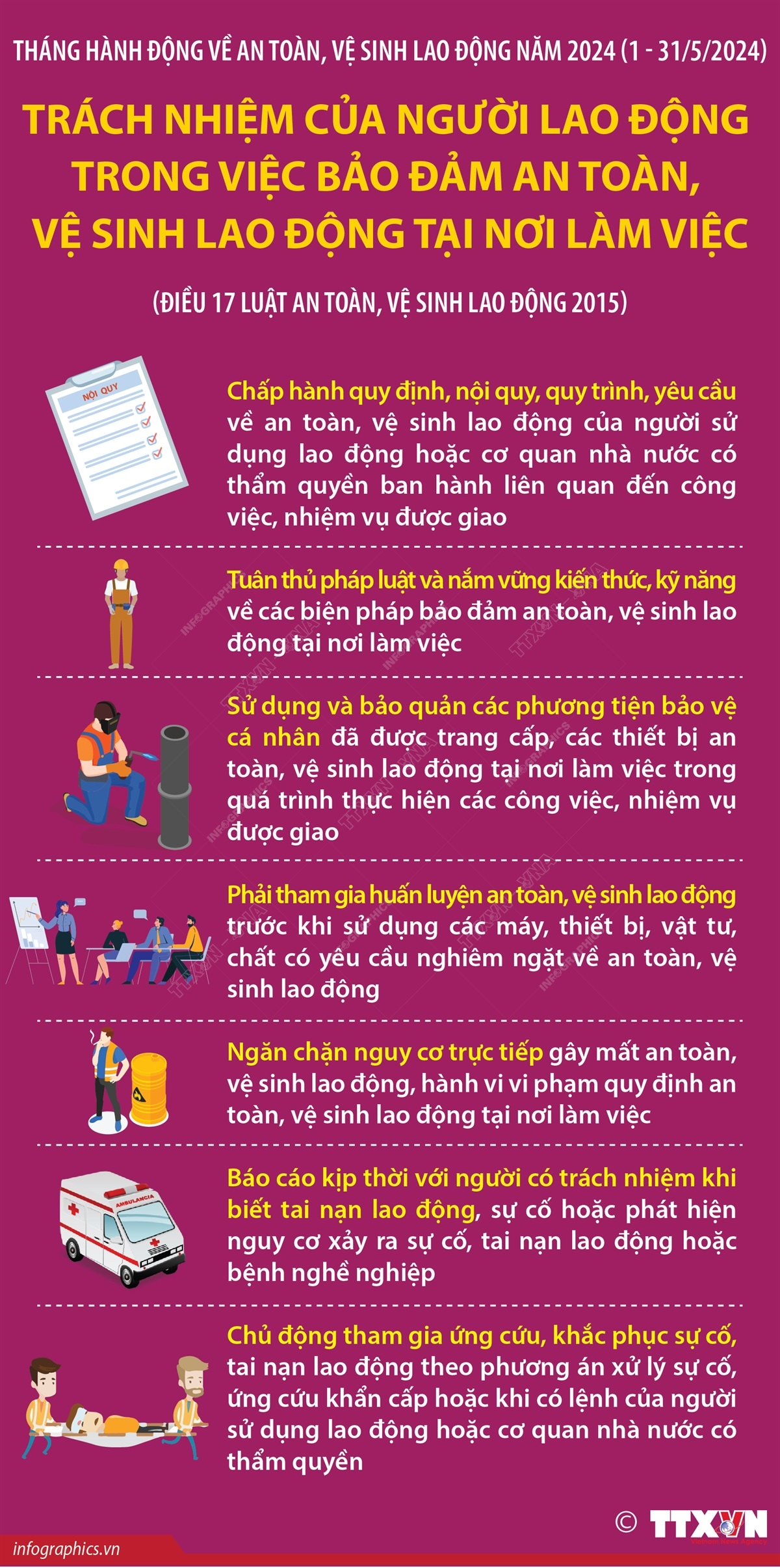Tháng hành động về an toàn, vệ sinh lao động diễn ra từ ngày 1 - 31/5/2024 với chủ đề “Tăng cường bảo đảm an toàn, vệ sinh lao động tại nơi làm việc và trong chuỗi cung ứng". Theo Điều 17 Luật An toàn, vệ sinh lao động 2015, để đảm bảo an toàn, vệ sinh lao động, người lao động có trách nhiệm: Chấp hành quy định, nội quy, quy trình, yêu cầu về an toàn, vệ sinh lao động của người sử dụng lao động hoặc cơ quan nhà nước có thẩm quyền ban hành liên quan đến công việc, nhiệm vụ được giao. Tuân thủ pháp luật và nắm vững kiến thức, kỹ năng về các biện pháp bảo đảm an toàn, vệ sinh lao động tại nơi làm việc; sử dụng và bảo quản các phương tiện bảo vệ cá nhân đã được trang cấp, các thiết bị an toàn, vệ sinh lao động tại nơi làm việc trong quá trình thực hiện các công việc, nhiệm vụ được giao…
