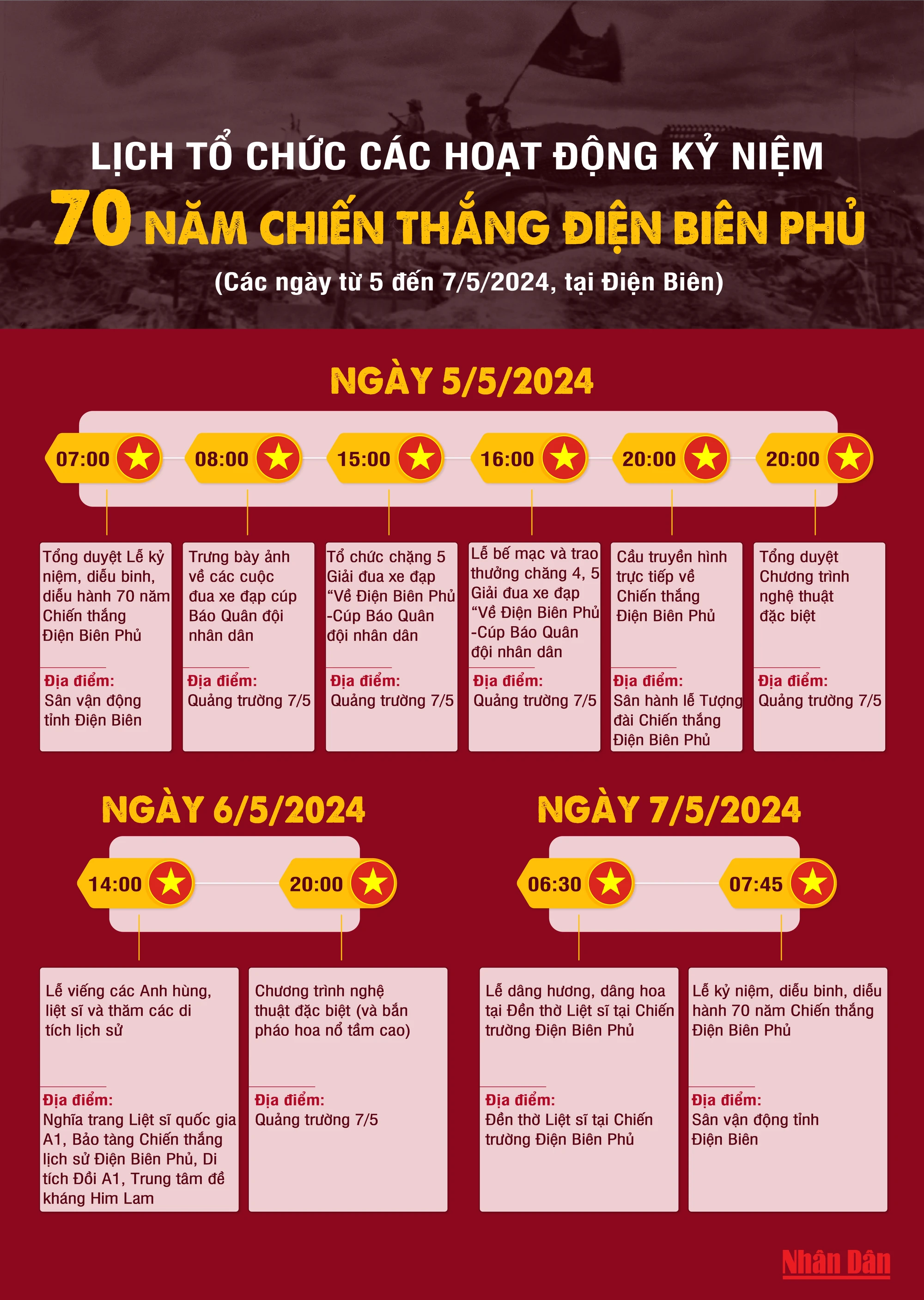 Lịch tổ chức các hoạt động kỷ niệm 70 năm Chiến thắng Điện Biên Phủ trong các ngày từ 5 đến 7/5, tại Điện Biên.