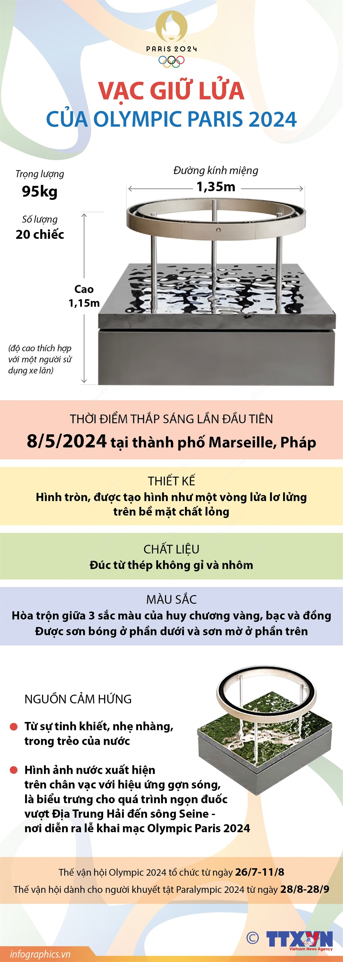 Thế vận hội Olympic 2024 sẽ được tổ chức từ ngày 26/7-11/8 và Thế vận hội dành cho người khuyết tật Paralympic 2024 từ ngày 28/8-28/9 tại Pháp. Vạc giữ lửa trong kỳ Thế vận hội lần này được công ty ArcelorMittal đúc từ thép không gỉ và nhôm. Mỗi chiếc vạc nặng 95kg, có đường kính miệng 1,35m và cao 1,15m - độ cao thích hợp để một người sử dụng xe lăn cũng có thể cầm được. Vạc có thiết kế hình tròn, được tạo hình như một vòng lửa lơ lửng trên bề mặt chất lỏng. Vạc giữ lửa Olympic 2024 được thắp sáng lần đầu tiên vào ngày 8/5/2024 tại thành phố Marseille.