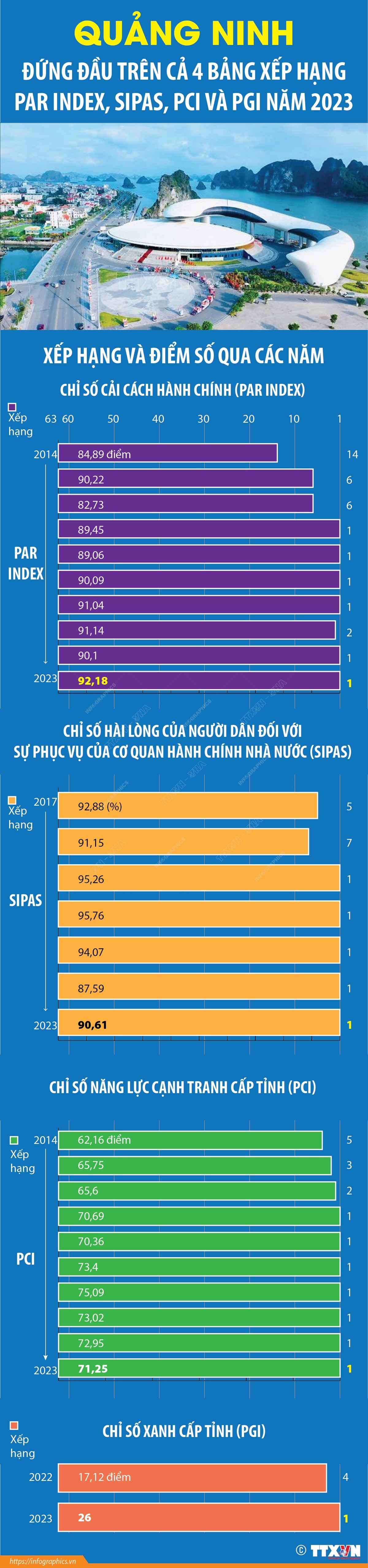 Năm 2023, Quảng Ninh xuất sắc xếp vị trí quán quân ở trên cả 4 bảng xếp hạng chỉ số quan trọng: Chỉ số cải cách hành chính (PAR Index), Chỉ số hài lòng của người dân đối với sự phục vụ của cơ quan hành chính nhà nước (SIPAS), Chỉ số năng lực cạnh tranh cấp tỉnh (PCI) và Chỉ số Xanh cấp tỉnh (PGI).