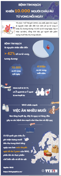 Tổ chức Y tế thế giới (WHO) cho biết bệnh tim mạch là nguyên nhân dẫn đến 40% số ca tử vong ở châu Âu (tương đương 10.000 ca tử vong/ngày, hay 4 triệu ca/năm), đồng thời kêu gọi người dân giảm lượng muối tiêu thụ trong bữa ăn.