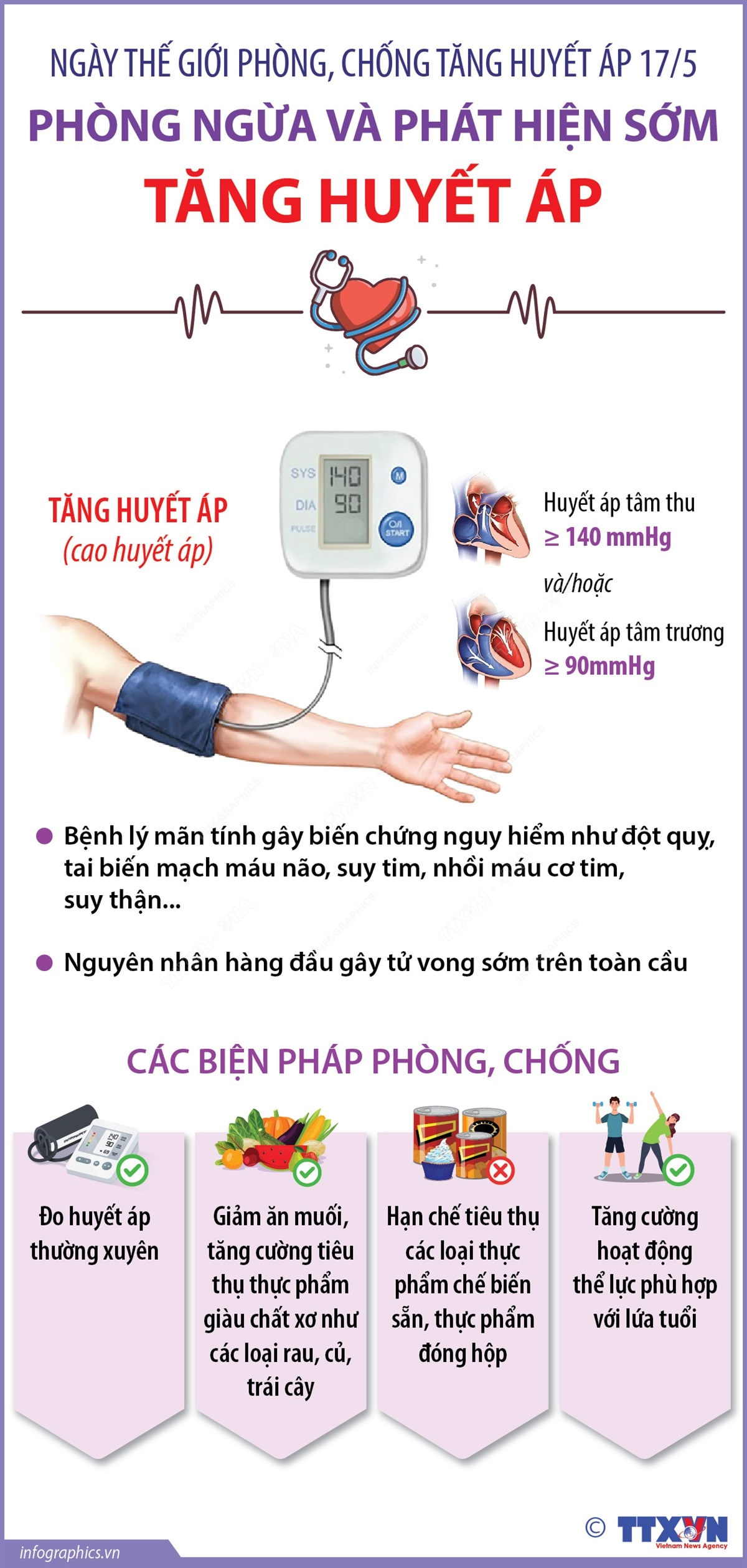 Tăng huyết áp (cao huyết áp) là tình trạng áp lực máu lên thành động mạch tăng cao hơn so với bình thường. Đây là bệnh được định nghĩa khi huyết áp tâm thu ≥ 140 mmHg và hoặc huyết áp tâm trương ≥ 90mmHg. Tăng huyết áp là bệnh lý mãn tính gây các biến chứng nguy hiểm như đột quỵ, tai biến mạch máu não, suy tim, nhồi máu cơ tim, suy thận,xuất huyết võng mạc… và là nguyên nhân hàng đầu gây ra tử vong sớm trên toàn cầu. Ở giai đoạn đầu, bệnh thường không có triệu chứng do đó nhiều người không được phát hiện và chẩn đoán kịp thời.