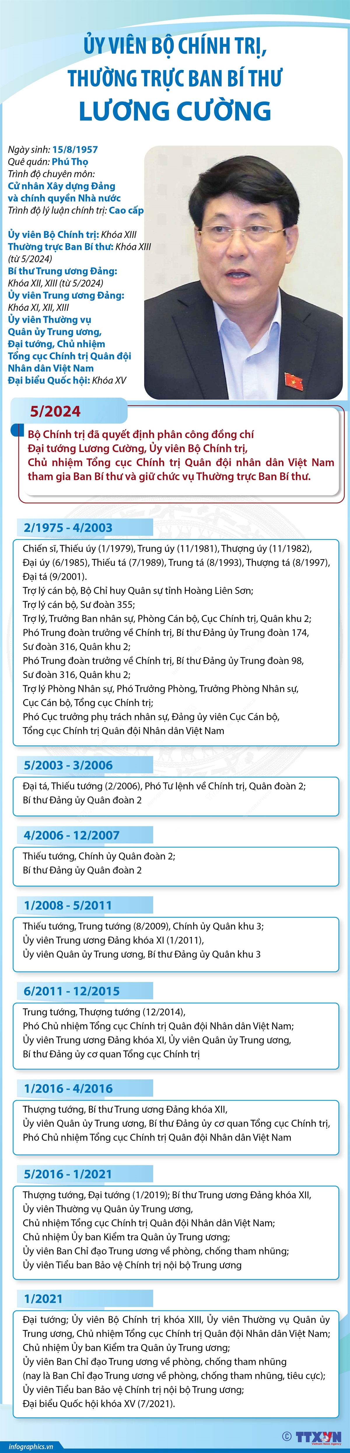 Hội nghị lần thứ chín Ban Chấp hành Trung ương Đảng khóa XIII đã khai mạc sáng 16/5/2024 tại Thủ đô Hà Nội. Trước khi Hội nghị, Bộ Chính trị báo cáo Ban Chấp hành Trung ương Đảng về việc Bộ Chính trị đã quyết định phân công đồng chí Đại tướng Lương Cường, Ủy viên Bộ Chính trị, Chủ nhiệm Tổng cục Chính trị Quân đội nhân dân Việt Nam tham gia Ban Bí thư và giữ chức vụ Thường trực Ban Bí thư; đồng chí Lê Minh Hưng, Bí thư Trung ương Đảng, Chánh Văn phòng Trung ương Đảng giữ chức vụ Trưởng Ban Tổ chức Trung ương, Chánh Văn phòng Trung ương Đảng.
