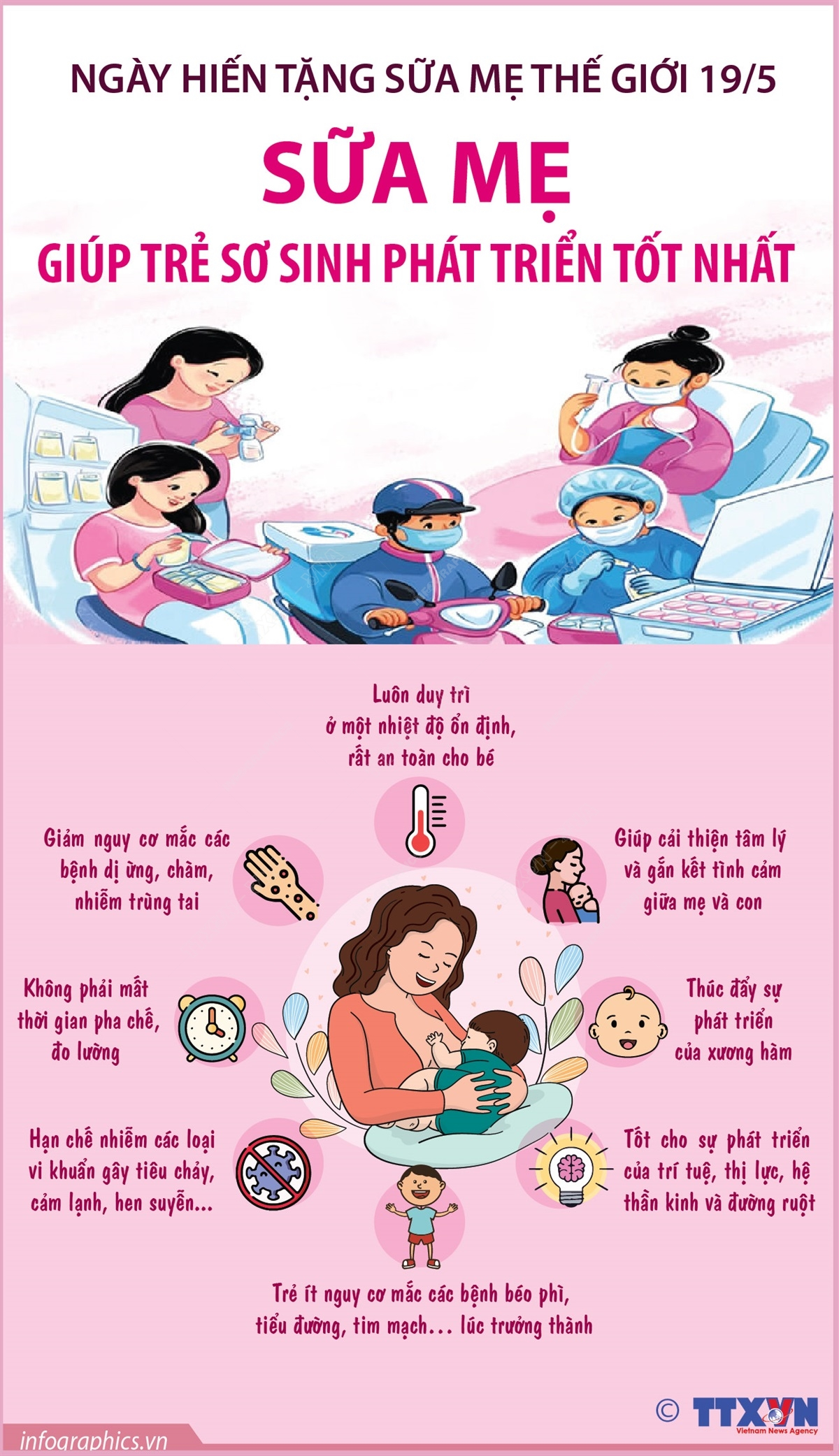 Ngày Hiến tặng Sữa mẹ Thế giới 19/5 là sự kiện được tổ chức hàng năm nhằm hướng tới tôn vinh những nghĩa cử hiến tặng sữa mẹ cao đẹp trên toàn cầu, góp phần cứu sống vô vàn trẻ em sinh non, nhẹ cân, có bệnh lý. Sữa mẹ là thức ăn hoàn chỉnh nhất, thích hợp nhất đối với trẻ, vì trong sữa mẹ có đủ chất dinh dưỡng cần thiết như đạm, đường, mỡ, năng lượng, vitamin và muối khoáng với tỷ lệ thích hợp cho sự hấp thụ và phát triển cơ thể trẻ.