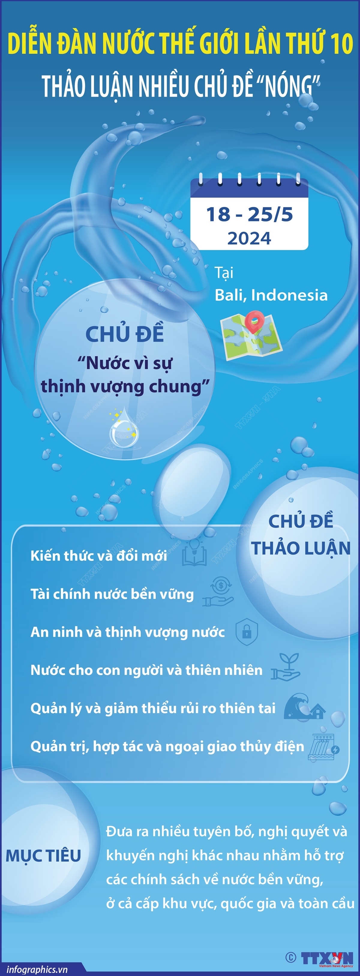 Diễn đàn Nước Thế giới (WWC) lần thứ 10 dự kiến được tổ chức tại Bali, Indonesia từ ngày 18 - 25/5/2024 tới với chủ đề “Nước vì sự thịnh vượng chung”. Theo nhận định của giới phân tích, tài nguyên nước thường được sử dụng như một công cụ chính trị bởi vai trò quan trọng của nước là nguồn sống của con người và kinh tế. Trên thực tế, tranh giành nguồn nước đã và đang xảy ra ở nhiều khu vực khác nhau trên thế giới, đặc biệt là ở các khu vực hoặc quốc gia có đường biên giới trên biển, trên sông. Các quốc gia ở thượng nguồn thường xung đột với các quốc gia ở hạ nguồn về các vấn đề quản lý, phân phối và sử dụng nước. Vì vậy, chính trị về nước là cần thiết để duy trì hòa bình thế giới. Điều này dẫn đến một loạt các chính sách, quy định, hành động và tương tác chính trị liên quan đến quản lý tài nguyên nước.