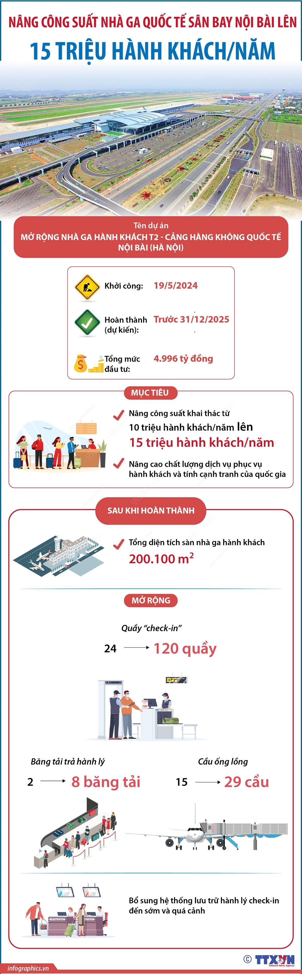 Thi công xây dựng và cung cấp, lắp đặt thiết bị công trình mở rộng nhà ga hành khách T2 - Cảng Hàng không Quốc tế Nội Bài là gói thầu chính và quan trọng nhất của dự án Mở rộng nhà ga hành khách T2 - Cảng Hàng không Quốc tế Nội Bài được khởi công ngày 19/5/2024. Mục tiêu là nâng công suất khai thác nhà ga T2 từ 10 triệu hành khách/năm lên 15 triệu hành khách/năm, đáp ứng nhu cầu ngày càng tăng của hành khách quốc tế, giảm thiểu tình trạng quá tải, nâng cao chất lượng dịch vụ và khả năng cạnh tranh của sân bay Nội Bài, góp phần thúc đẩy việc phát triển kinh tế - xã hội của đất nước, đặc biệt là Thủ đô Hà Nội.