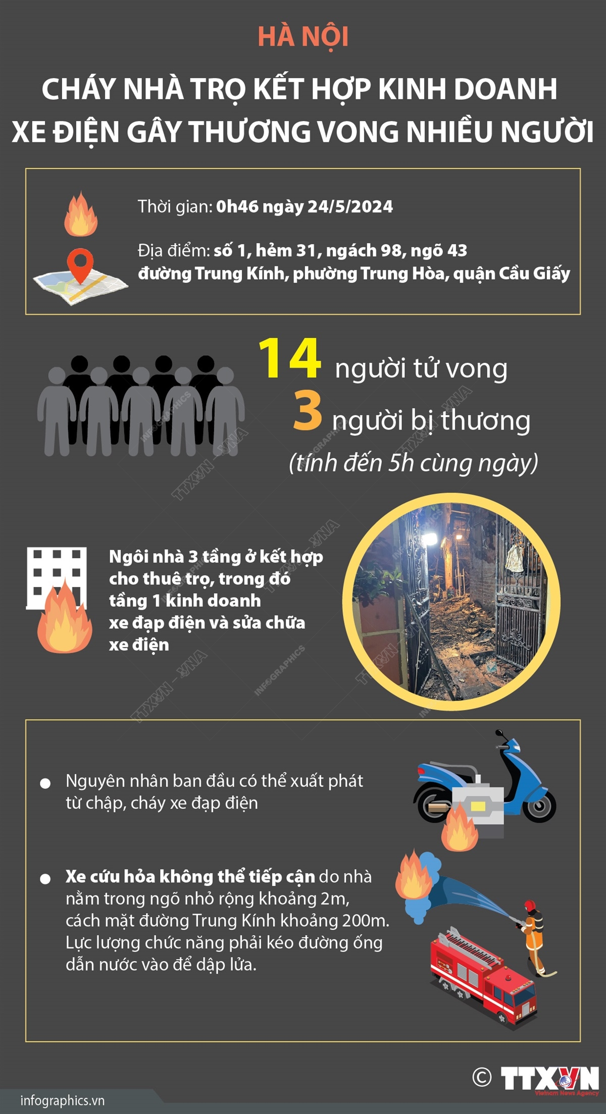 Vào lúc 0h46 ngày 24/5/2024, ngôi nhà tại số 1, hẻm 31, ngách 98, ngõ 43 đường Trung Kính, phường Trung Hòa, quận Cầu Giấy (Hà Nội) bốc cháy dữ dội đã làm thương vong nhiều người. Các lực lượng chức năng đã nhanh chóng tập trung dập lửa, cứu người. Nguyên nhân ban đầu có thể xuất phát từ chập, cháy xe đạp điện. Đến 5h sáng cùng ngày, có 14 người đã thiệt mạng, 3 người bị thương trong vụ hỏa hoạn.