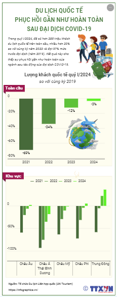 Trong quý I/2024, đã có hơn 285 triệu khách du lịch quốc tế trên toàn cầu, nhiều hơn 20% so với cùng kỳ năm 2023 và đạt 97% mức trước đại dịch (năm 2019). Kết quả này cho thấy sự phục hồi gần như hoàn toàn của ngành sau tác động của đại dịch COVID-19.