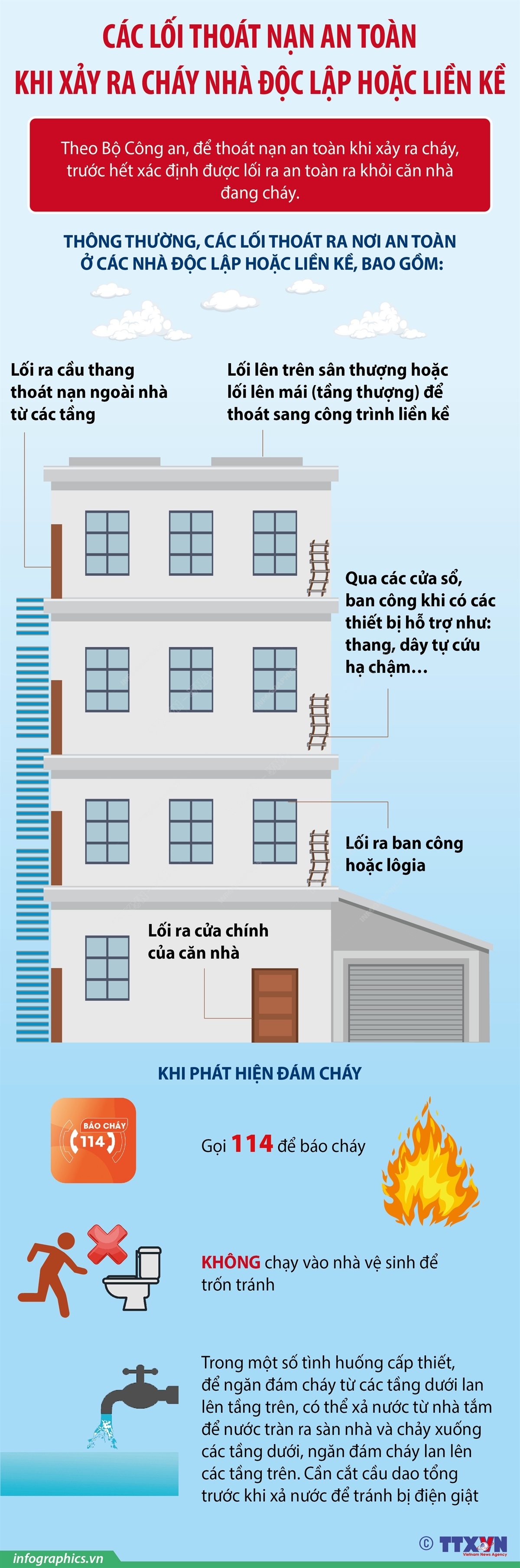 Theo Bộ Công an, để thoát nạn an toàn khi xảy ra cháy nhà độc lập hoặc liền kề, trước hết xác định được lối ra an toàn ra khỏi căn nhà đang cháy. Thông thường, các lối thoát ra nơi an toàn ở các nhà độc lập hoặc liền kề bao gồm: Lối ra cửa chính của căn nhà; lối ra cầu thang thoát nạn ngoài nhà từ các tầng; lối ra ban công hoặc lôgia; lối lên trên sân thượng hoặc lối lên mái (tầng thượng) để thoát sang công trình liền kề. Ngoài ra, đối với các căn hộ độc lập thì lối thoát nạn an toàn là qua các cửa sổ, ban công khi có các thiết bị hỗ trợ như: thang, dây tự cứu hạ chậm…