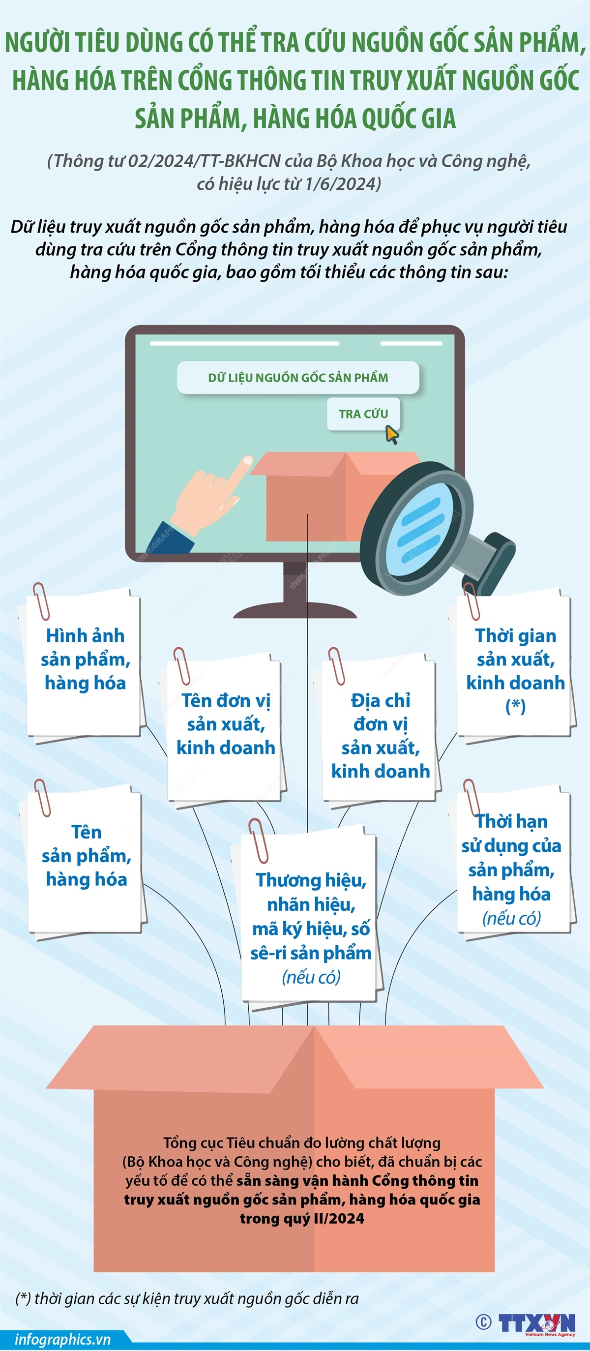Theo Thông tư 02/2024/TT-BKHCN ngày 28/3/2024 của Bộ Khoa học và Công nghệ quy định về quản lý truy xuất nguồn gốc sản phẩm, hàng hóa, từ 1/6/2024, dữ liệu truy xuất nguồn gốc sản phẩm, hàng hóa để phục vụ người tiêu dùng tra cứu trên Cổng thông tin truy xuất nguồn gốc sản phẩm, hàng hóa quốc gia, bao gồm tối thiểu các thông tin sau: Tên sản phẩm, hàng hóa; Hình ảnh sản phẩm, hàng hóa; Tên đơn vị sản xuất, kinh doanh; địa chỉ đơn vị sản xuất, kinh doanh; thời gian sản xuất, kinh doanh (thời gian các sự kiện truy xuất nguồn gốc diễn ra); thương hiệu, nhãn hiệu, mã ký hiệu, số sê-ri sản phẩm (nếu có) và thời hạn sử dụng của sản phẩm, hàng hóa (nếu có).