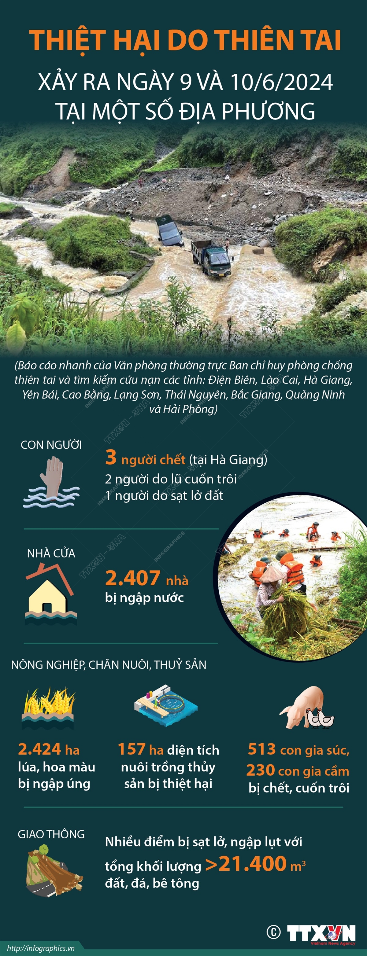 Theo báo cáo nhanh của Văn phòng thường trực Ban chỉ huy phòng chống thiên tai và tìm kiếm cứu nạn các tỉnh Điện Biên, Lào Cai, Hà Giang, Yên Bái, Cao Bằng, Lạng Sơn, Thái Nguyên, Bắc Giang, Quảng Ninh và Hải Phòng, mưa lớn, ngập úng, lũ, sạt lở đất xảy ra ngày 9 và 10/6/2024 làm 3 người chết tại Hà Giang, hơn 2.400 nhà bị ngập nước, hơn 2.400 ha lúa, hoa màu bị ngập úng, thiệt hại… Sau khi thiên tai xảy ra, chính quyền các địa phương đã huy động lực lượng tại chỗ hỗ trợ người dân khắc phục thiệt hại; tiếp tục tổ chức rà soát, thống kê, đánh giá thiệt hại.