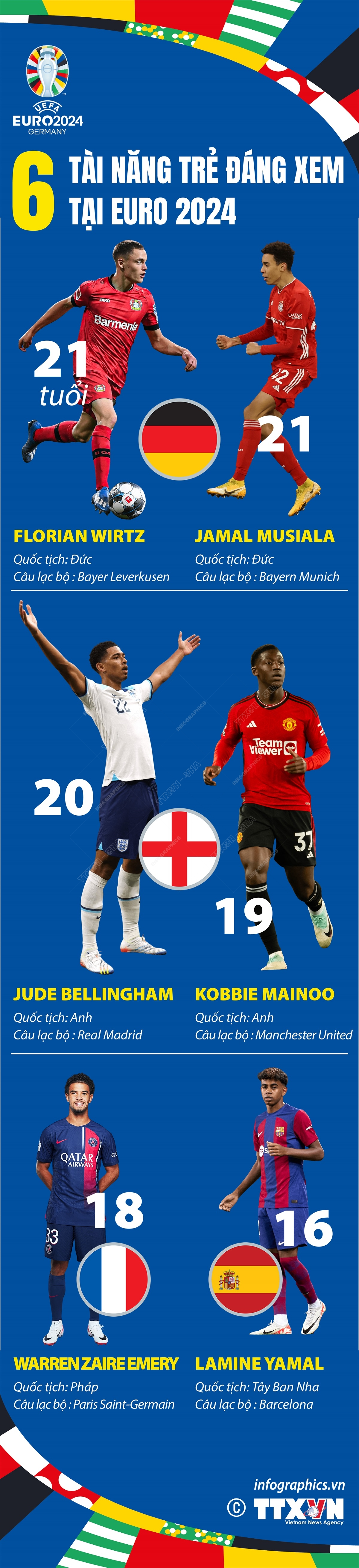 Toàn bộ 51 trận đấu tại EURO 2024 diễn ra tại Đức từ ngày 15/6 đến 15/7/2024. EURO 2024 hứa hẹn là nơi nhiều ngôi sao trẻ tỏa sáng sau một mùa giải bùng nổ ở cấp độ câu lạc bộ.