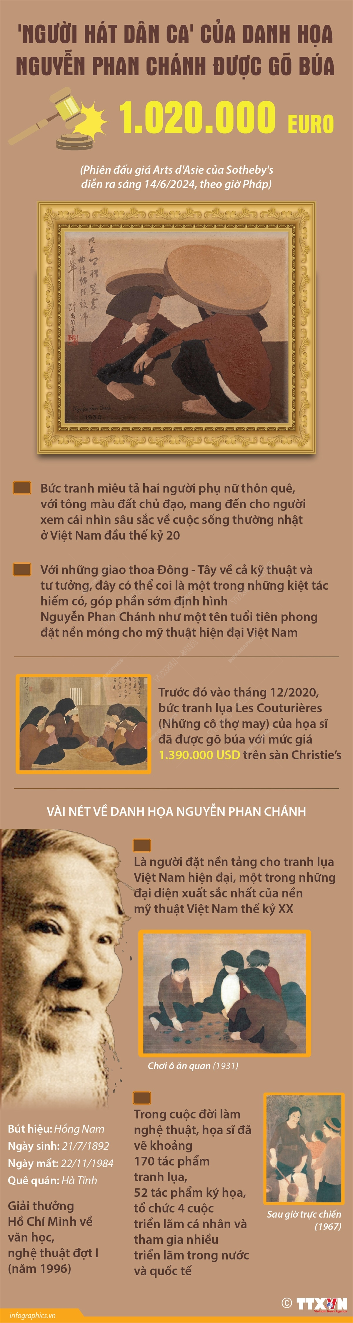 Bức "Người hát dân ca" của họa sĩ Nguyễn Phan Chánh vừa được bán với giá 1.020.000 euro (hơn 27 tỷ đồng), lọt vào top 20 tranh Việt đắt giá nhất tính đến hiện tại. Đây là tác phẩm thứ hai của họa sĩ Nguyễn Phan Chánh đạt mốc triệu USD, sau bức tranh lụa Les Couturières (Những cô thợ may), được gõ búa 1.390.000 USD trên sàn Christie’s tháng 12/2020.