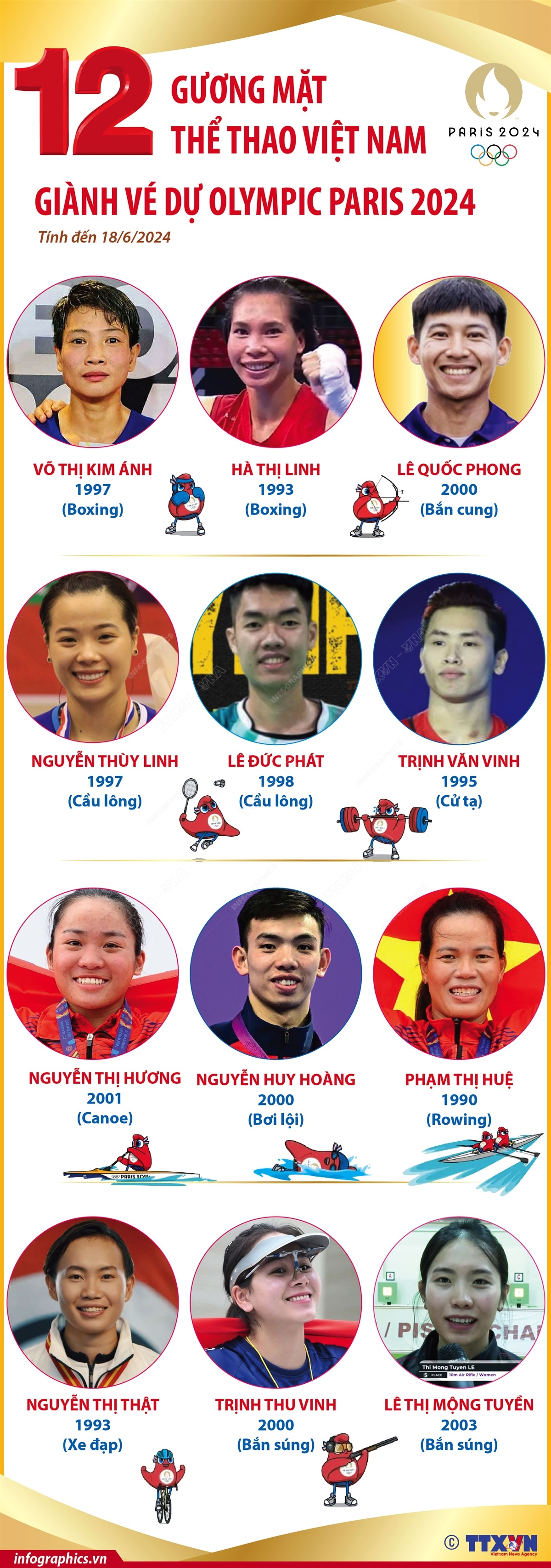 12 gương mặt thể thao Việt Nam giành vé dự Olympic Paris 2024 (tính đến 18/6/2024)