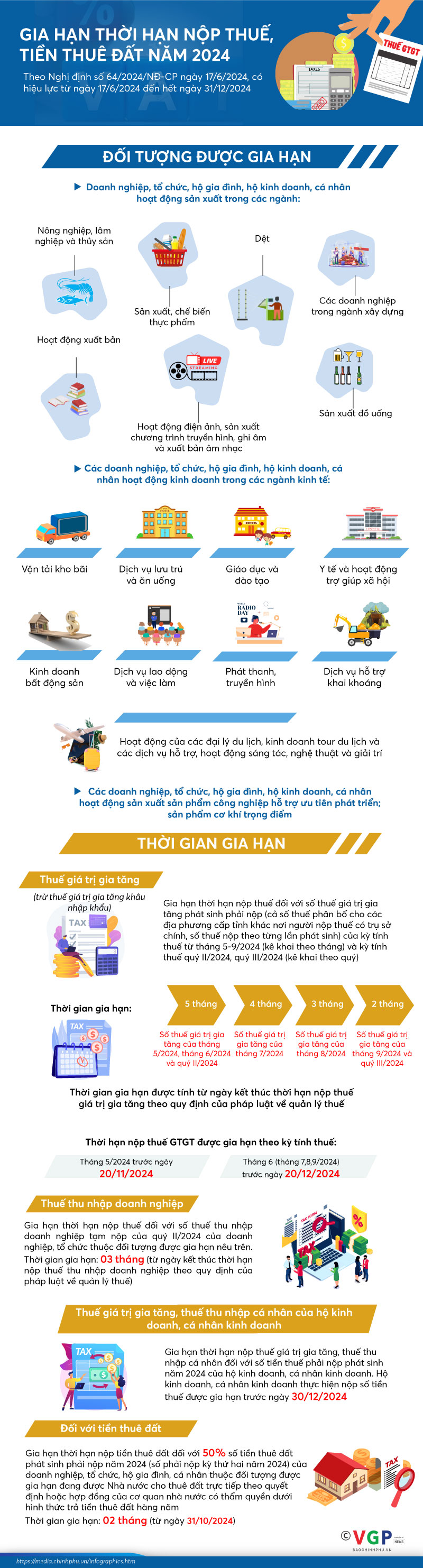 Chính phủ vừa ban hành Nghị định số 64/2024/NĐ-CP gia hạn thời hạn nộp thuế giá trị gia tăng, thuế thu nhập doanh nghiệp, thuế thu nhập cá nhân và tiền thuê đất trong năm 2024.