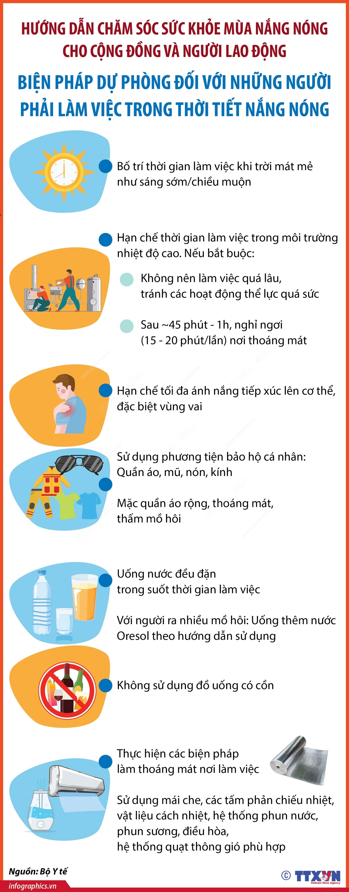 Theo dự báo của Trung tâm dự báo khí tượng thủy văn quốc gia, năm 2024, do ảnh hưởng của hiện tượng El Nino, nắng nóng có khả năng xuất hiện nhiều đợt và gay gắt hơn trung bình nhiều năm ảnh hưởng đến sức khỏe người dân, người lao động. Bộ Y tế đã xây dựng Hướng dẫn chăm sóc sức khỏe mùa nắng nóng cho cộng đồng và người lao động nhằm giúp người dân có những kiến thức cơ bản trong việc thực hiện các biện pháp phòng, chống một số vấn đề sức khỏe thường gặp. Trong đó hướng dẫn các biện pháp dự phòng đối với những người phải làm việc trong thời tiết nắng nóng.