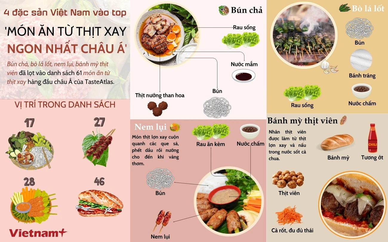 Bún chả, bò lá lốt, nem lụi và bánh mỳ thịt viên lọt vào danh sách những món ăn từ thịt xay ngon nhất châu Á do TasteAtlas, chuyên trang hướng dẫn du lịch ẩm thực nổi tiếng thế giới, bình chọn.