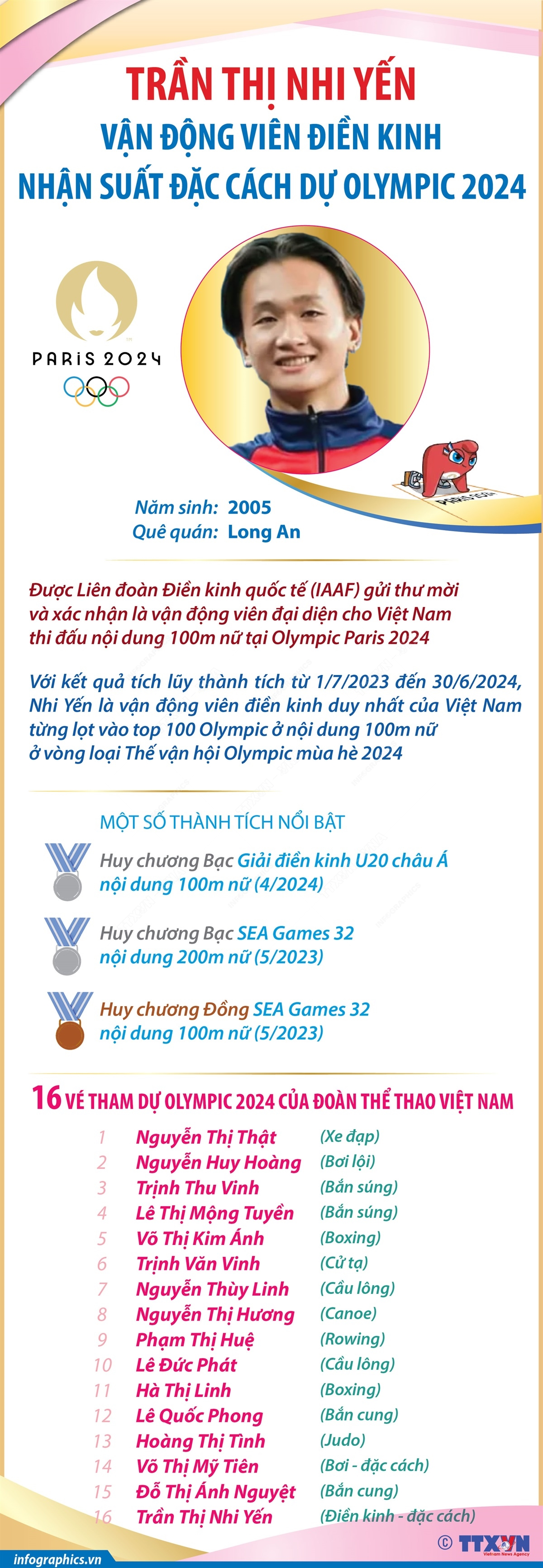Vận động viên điền kinh Trần Thị Nhi Yến đã được Liên đoàn Điền kinh quốc tế (IAAF) gửi thư mời và xác nhận là vận động viên đại diện cho Việt Nam thi đấu nội dung 100m nữ tại Olympic Paris 2024. Do đó, Đoàn thể thao Việt Nam sẽ có tổng 16 vé tham dự Olympic Paris 2024.