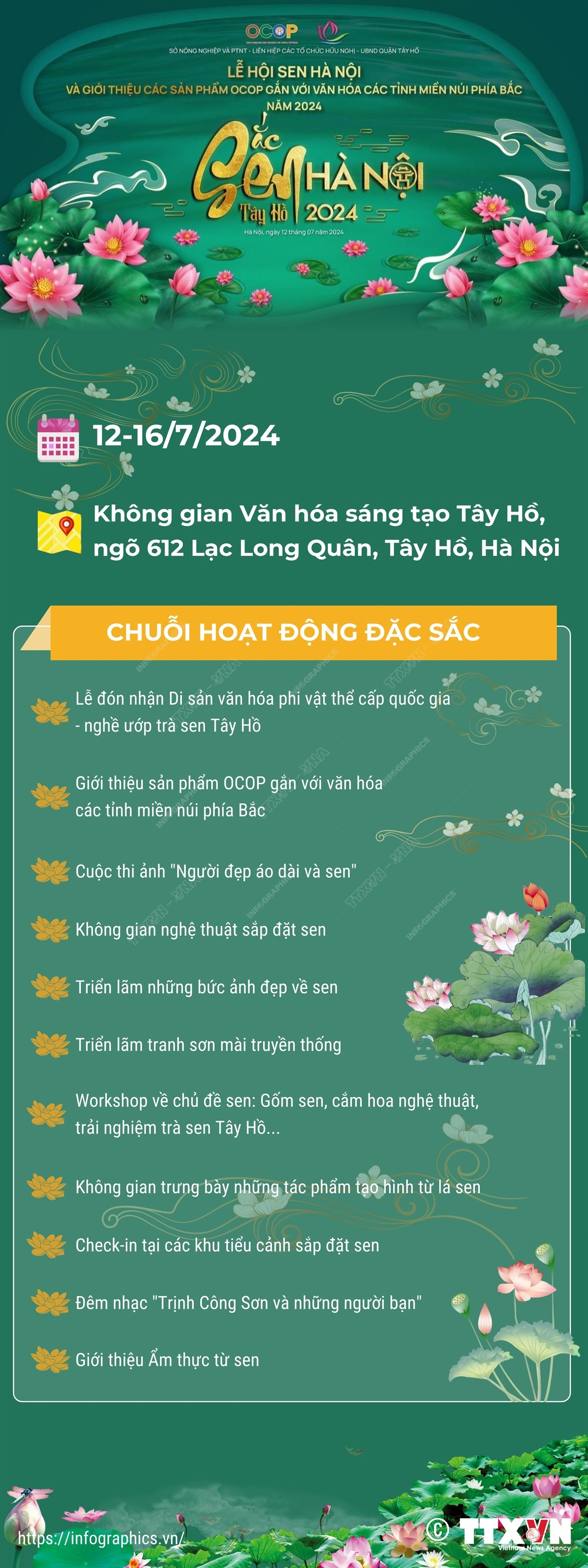 Với chủ đề "Sắc sen Hà Nội," lễ hội Sen Hà Nội lần đầu tiên tổ chức từ ngày 12-16/7/2024 tại Không gian Văn hóa sáng tạo Tây Hồ, quận Tây Hồ, sẽ mang đến cho du khách trải nghiệm hấp dẫn về hoa sen và đặc sản trà sen của Hà Nội. Trong khuôn khổ Lễ hội, sẽ diễn ra lễ đón nhận Di sản Văn hóa Phi Vật thể cấp Quốc gia - nghề ướp trà sen Tây Hồ. Lễ hội Sen Hà Nội được tổ chức nhằm quảng bá, tôn vinh những nét đẹp, giá trị văn hóa của Thăng Long Hà Nội, của vùng đất Tây Hồ. Lễ hội giới thiệu những giá trị độc đáo của nghề "ướp trà sen," những nét đặc trưng riêng có của văn hóa sen trong đời sống của người Việt Nam.