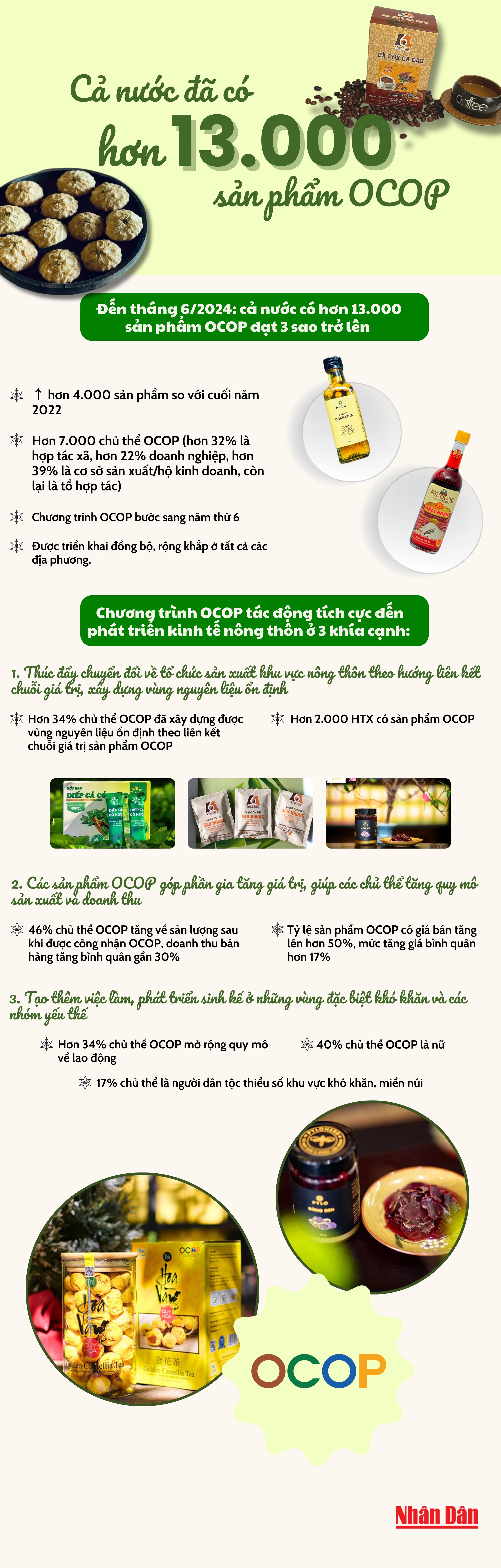 Chương trình Mỗi xã một sản phẩm (Chương trình OCOP) đã bước sang năm thứ 6 và được triển khai đồng bộ, rộng khắp ở tất cả các địa phương. Tính đến tháng 6/2024, cả nước đã có hơn 13.000 sản phẩm OCOP đạt 3 sao trở lên, tăng hơn 4.000 sản phẩm so với cuối năm 2022.