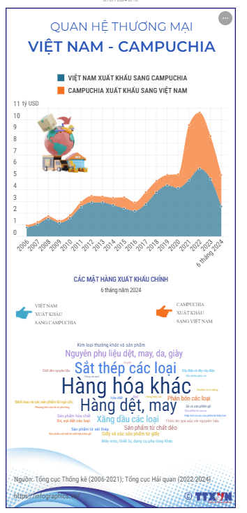 Hơn 10 năm qua, kim ngạch thương mại song phương Việt Nam-Campuchia luôn duy trì tốc độ tăng trưởng ấn tượng, là điểm sáng trong quan hệ hợp tác giữa hai nước.