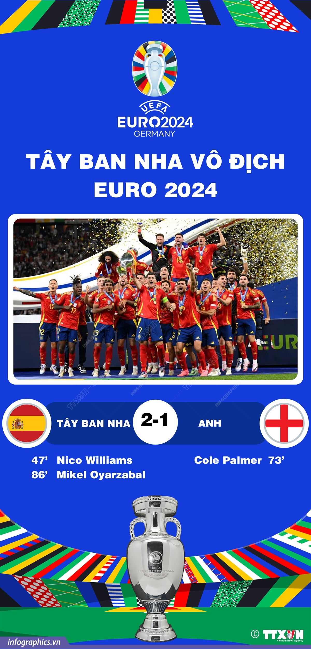 Rạng sáng 15/7/2024, đội tuyển Tây Ban Nha đã trở thành nhà vô địch EURO 2024 sau chiến thắng kịch tính 2-1 trước Đội tuyển Anh ở chung kết. Nico Williams và Mikel Oyarzabal thay nhau lập công để mang chiếc cúp vô địch về cho Đội tuyển Tây Ban Nha. Thành tích này giúp Tây Ban Nha thiết lập nên kỷ lục với tư cách đội bóng đầu tiên trong lịch sử giành 4 chức vô địch EURO. Kết quả của Tây Ban Nha càng trở nên ấn tượng hơn khi mà đội bóng này giành cả 7 chiến thắng trên hành trình của mình.