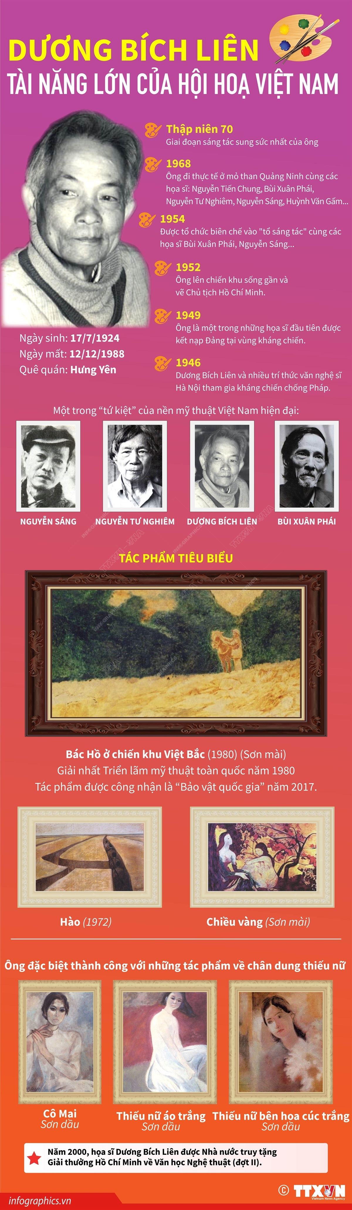 Dương Bích Liên là một trong những họa sĩ cách mạng đầu tiên trong làng hội họa Việt Nam. Ông là một trong bộ bốn “Nghiêm, Liên, Sáng, Phái” (Nguyễn Sáng, Nguyễn Tư Nghiêm, Dương Bích Liên, Bùi Xuân Phái) của nền mỹ thuật hiện đại Việt Nam. Tên tuổi và sự nghiệp ông đã được ghi nhận bởi danh hiệu cao quý: Giải thưởng Hồ Chí Minh về Văn học nghệ thuật năm 2000. Ông sinh ngày 17/7/1924, cách đây tròn 100 năm.