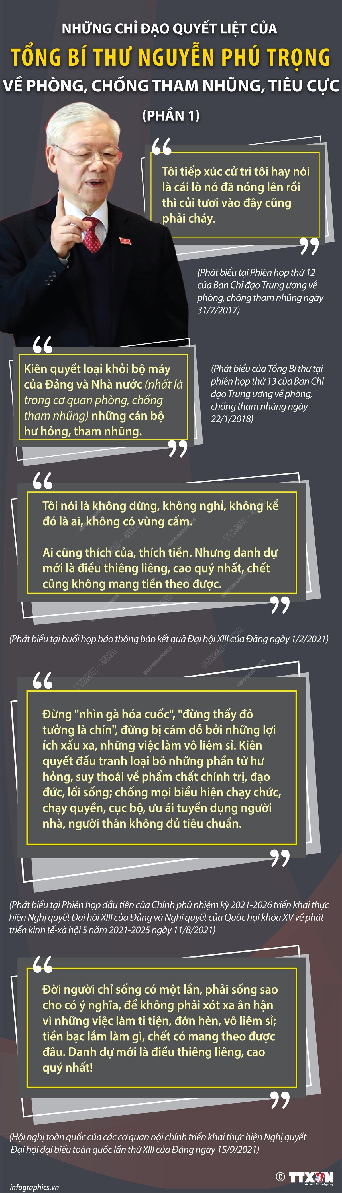 Trong suốt cuộc đời cống hiến cho sự nghiệp cách mạng của Đảng và dân tộc, Tổng Bí thư Nguyễn Phú Trọng đã có những phát biểu, ý kiến tâm huyết, sâu sắc nhằm xây dựng Đảng trong sạch, vững mạnh và quyết liệt đấu tranh phòng, chống tham nhũng, tiêu cực. Là Trưởng Ban Chỉ đạo Trung ương về phòng, chống tham nhũng, tiêu cực, với quyết tâm chính trị rất cao, Tổng Bí thư Nguyễn Phú Trọng đã chỉ đạo quyết liệt, kiên trì, đồng bộ, toàn diện, bài bản, đi vào chiều sâu, có bước đột phá, gắn liền giữa phòng, chống tham nhũng, tiêu cực với xây dựng, chỉnh đốn Đảng và hệ thống chính trị.