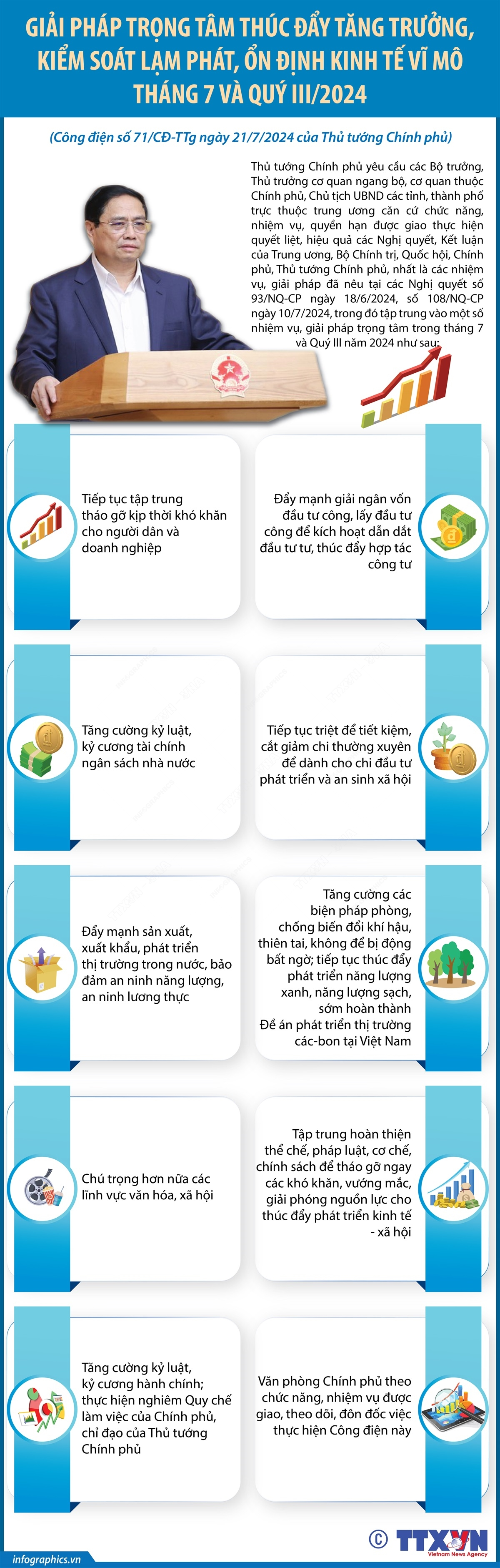 Thủ tướng Chính phủ Phạm Minh Chính vừa ký ban hành Công điện số 71/CĐ-TTg ngày 21/7/2024 về các nhiệm vụ, giải pháp trọng tâm thúc đẩy tăng trưởng, kiểm soát lạm phát, ổn định kinh tế vĩ mô tháng 7 và Quý III năm 2024. Thủ tướng Chính phủ yêu cầu các Bộ trưởng, Thủ trưởng cơ quan ngang bộ, cơ quan thuộc Chính phủ, Chủ tịch UBND các tỉnh, thành phố trực thuộc trung ương căn cứ chức năng, nhiệm vụ, quyền hạn được giao thực hiện quyết liệt, hiệu quả các Nghị quyết, Kết luận của Trung ương, Bộ Chính trị, Quốc hội, Chính phủ, Thủ tướng Chính phủ, nhất là các nhiệm vụ, giải pháp đã nêu tại các Nghị quyết số 93/NQ-CP ngày 18/6/2024, số 108/NQ-CP ngày 10/7/2024, trong đó tập trung vào một số nhiệm vụ, giải pháp trọng tâm trong tháng 7 và Quý III năm 2024.