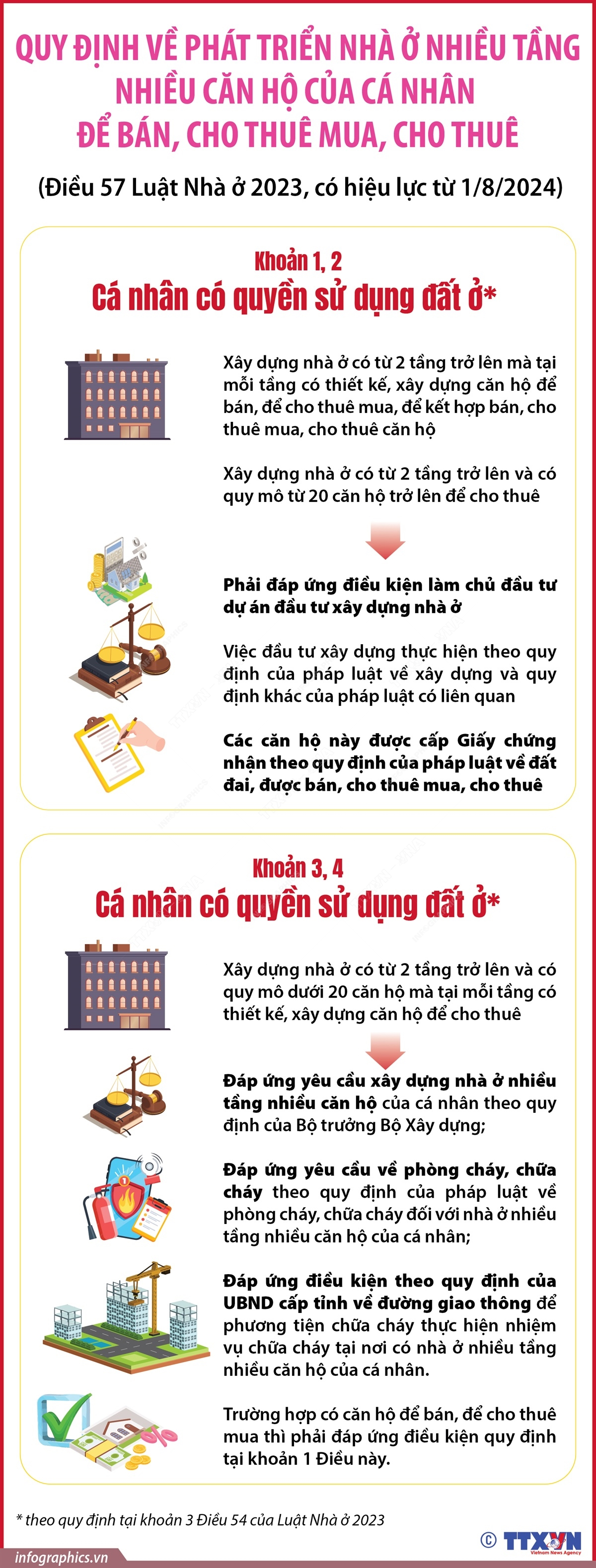 Theo Điều 57 Luật Nhà ở 2023, từ 1/8/2024, cá nhân có quyền sử dụng đất ở theo quy định tại khoản 3 Điều 54 của Luật này xây dựng nhà ở có từ 2 tầng trở lên mà tại mỗi tầng có thiết kế, xây dựng căn hộ để bán, để cho thuê mua, để kết hợp bán, cho thuê mua, cho thuê căn hộ; Nhà ở có từ 2 tầng trở lên và có quy mô từ 20 căn hộ trở lên để cho thuê thì phải đáp ứng điều kiện làm chủ đầu tư dự án đầu tư xây dựng nhà ở. Việc đầu tư xây dựng thực hiện theo quy định của pháp luật về xây dựng và quy định khác của pháp luật có liên quan đối với dự án đầu tư xây dựng nhà ở. Các căn hộ này được cấp Giấy chứng nhận theo quy định của pháp luật về đất đai, được bán, cho thuê mua, cho thuê theo quy định của Luật này, pháp luật về kinh doanh bất động sản.