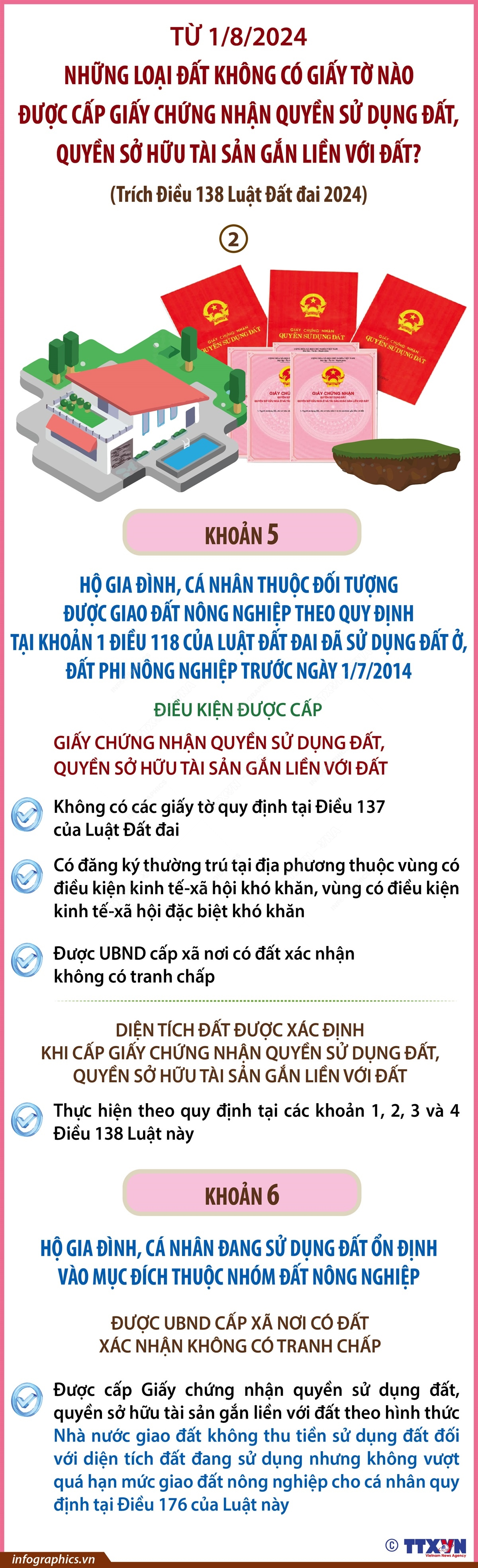 Theo Luật Đất đai 2024, từ 1/8/2024, cấp Giấy chứng nhận quyền sử dụng đất, quyền sở hữu tài sản gắn liền với đất đối với trường hợp hộ gia đình, cá nhân đang sử dụng đất không có giấy tờ về quyền sử dụng đất mà không vi phạm pháp luật về đất đai, không thuộc trường hợp đất được giao không đúng thẩm quyền trước 1/7/2014.