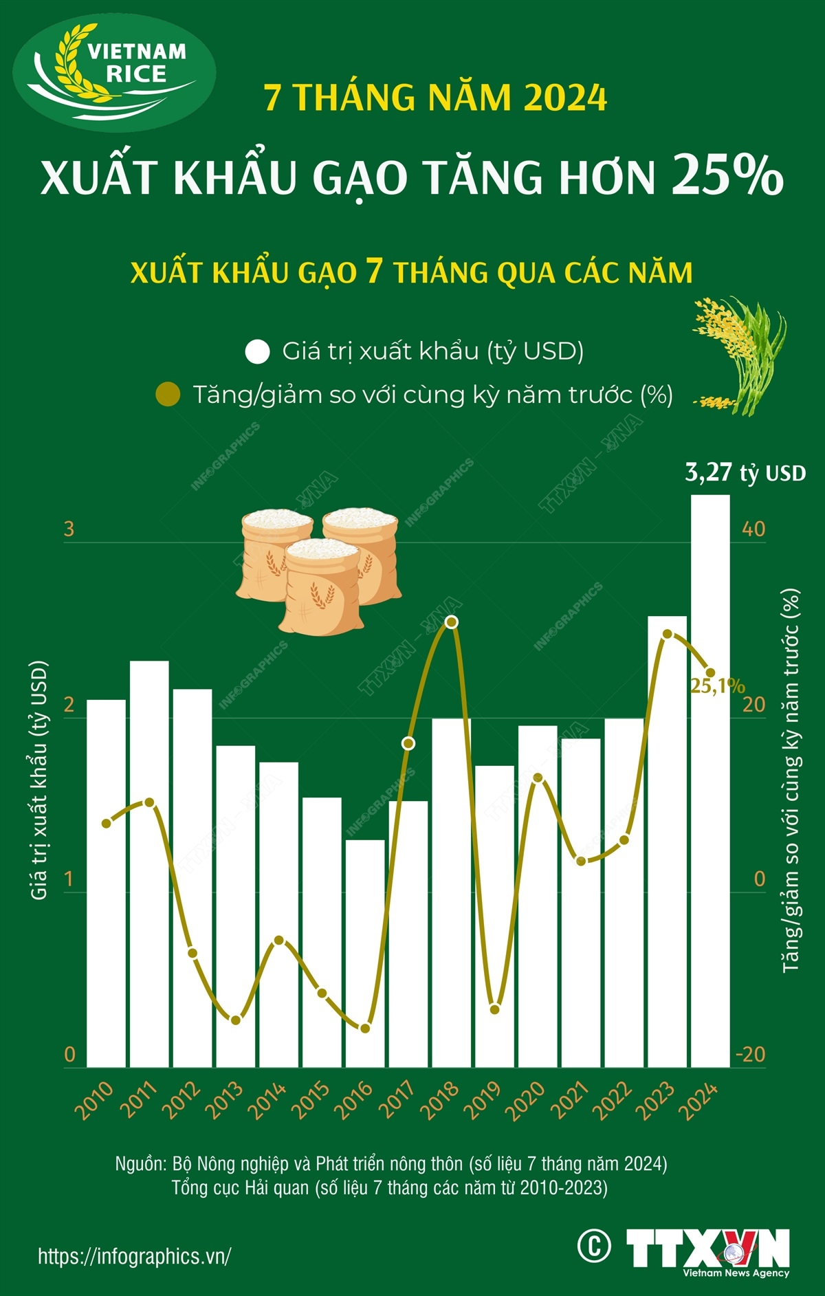 Theo Bộ Bộ Nông nghiệp và Phát triển nông thôn, trong 7 tháng năm 2024, Việt Nam đã xuất khẩu 5,18 triệu tấn gạo, tương đương 3,27 tỷ USD, tăng 5,8% về lượng và tăng 25,1% về giá trị so với cùng kỳ năm 2023. Việt Nam đặt mục tiêu tổng kim ngạch xuất khẩu gạo năm 2024 đạt trên 5 tỷ USD.