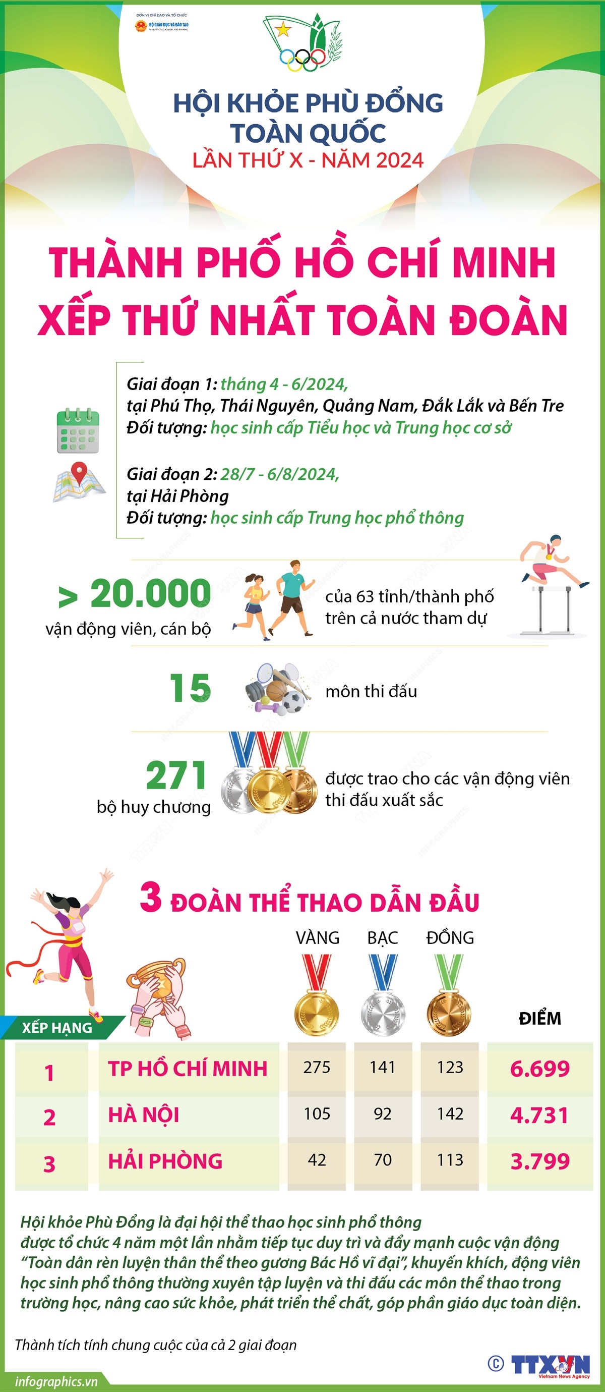Chiều 6/8/2024, Bộ Giáo dục và Đào tạo cùng UBND thành phố Hải Phòng tổ chức Lễ bế mạc Hội khỏe Phù Đổng toàn quốc lần thứ X năm 2024 sau 10 ngày thi đấu sôi nổi, hào hứng. Hội khỏe năm nay có sự tham dự của hơn 20.000 vận động viên, cán bộ của 63 tỉnh, thành phố trên khắp cả nước, tham gia thi đấu ở 15 môn thể thao. Đây là Hội khỏe có quy mô lớn nhất từ trước đến nay, thể hiện sự quan tâm, ủng hộ của các cấp chính quyền địa phương đối với ngành Giáo dục; đồng thời cho thấy, sự trưởng thành nhanh chóng của thể thao học đường.