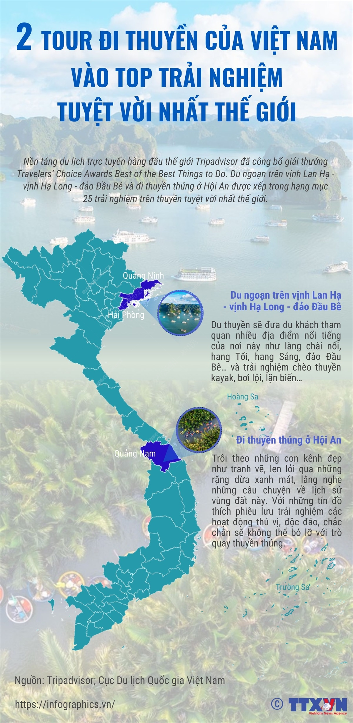 Nền tảng du lịch trực tuyến hàng đầu thế giới Tripadvisor đã công bố giải thưởng Travelers’ Choice Awards Best of the Best Things to Do. Du ngoạn trên vịnh Lan Hạ - vịnh Hạ Long - đảo Đầu Bê và đi thuyền thúng ở Hội An được xếp trong hạng mục 25 trải nghiệm trên thuyền tuyệt vời nhất thế giới.
