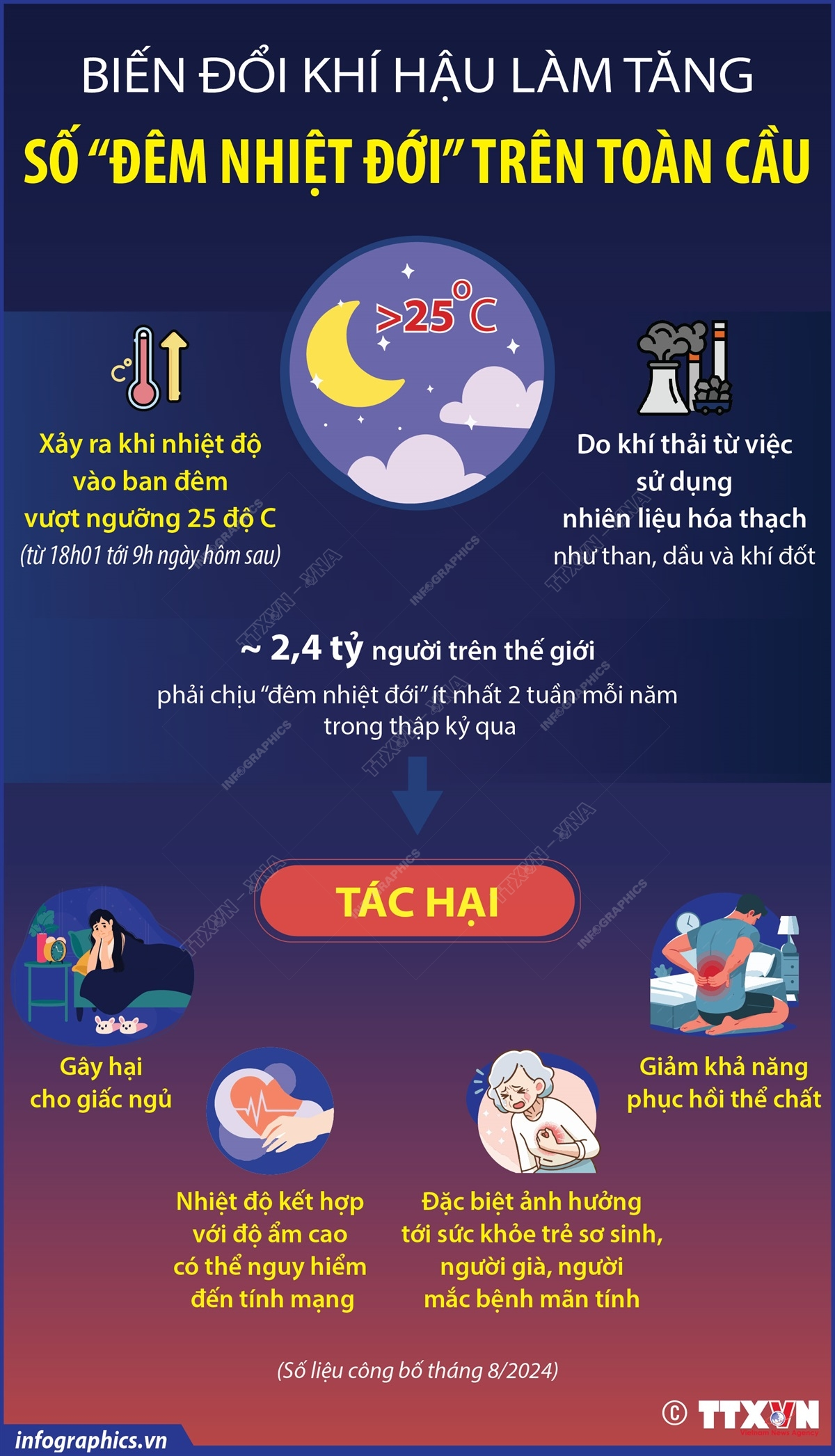 Theo các chuyên gia, biến đổi khí hậu, do con người gây ra, đang khiến hơn 30% dân số thế giới đối mặt với nhiều “đêm nhiệt đới” hơn, gây tác hại không nhỏ tới sức khỏe con người, đặc biệt là trẻ nhỏ, người cao tuổi và người có bệnh lý nền.