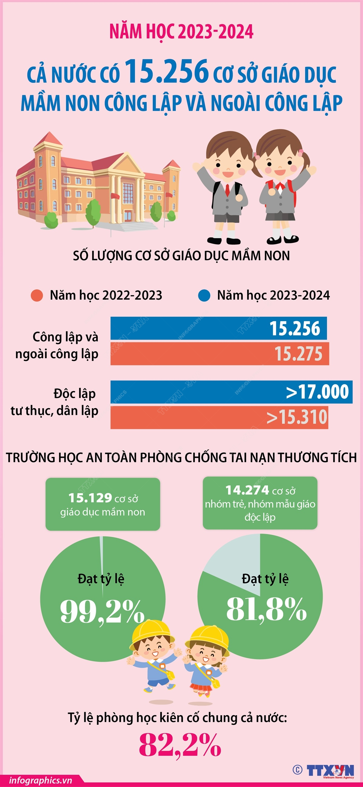 Năm học 2023-2024, cả nước có 15.256 cơ sở giáo dục mầm non (giảm 19 cơ sở giáo dục mầm non so với năm học trước), với 18.115 điểm trường lẻ (giảm 1.283 điểm trường) và hơn 17.000 cơ sở giáo dục mầm non độc lập tư thục, dân lập (tăng 1.690 cơ sở so với năm học trước).