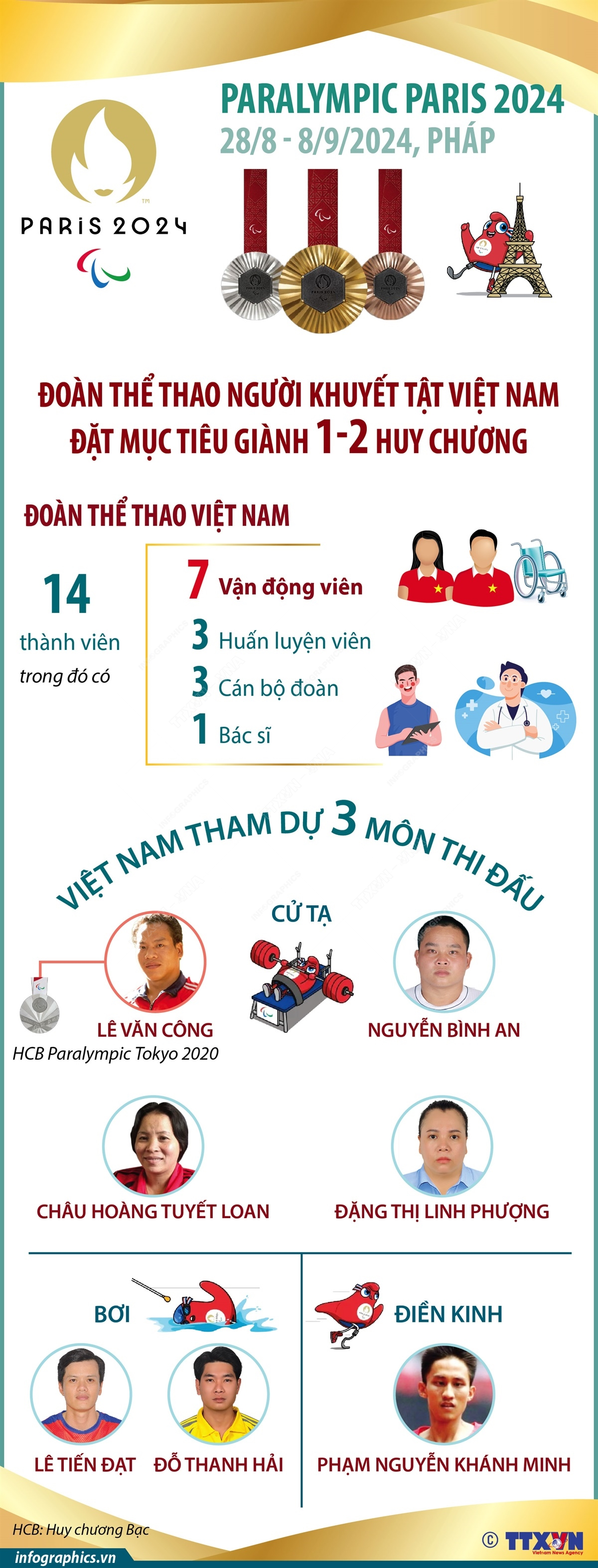 Đoàn Thể thao người khuyết tật Việt Nam tham dự Paralympic Paris 2024 với 7 vận động viên, trong đó có 5 vận động viên nam và 2 vận động viên nữ, thi đấu 6 nội dung ở 3 môn thể thao gồm: Điền kinh, Bơi và Cử tạ. Mục tiêu của Đoàn Thể thao người khuyết tật Việt Nam đặt ra tại Paralympic Paris 2024 là giành được 1-2 huy chương.