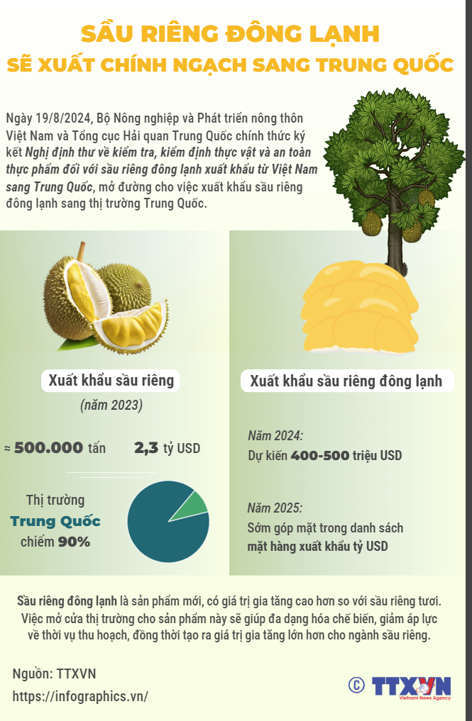 Việt Nam và Trung Quốc chính thức ký kết Nghị định thư về kiểm tra, kiểm định thực vật và an toàn thực phẩm đối với sầu riêng đông lạnh xuất khẩu từ Việt Nam sang Trung Quốc.