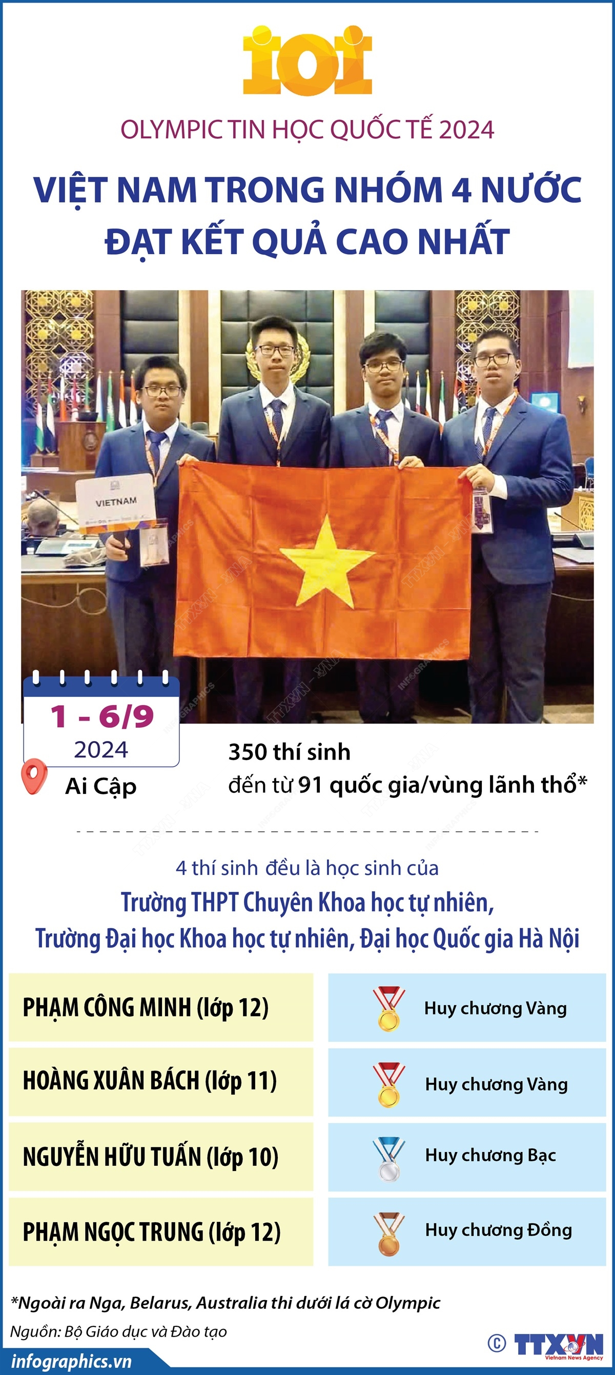 Theo thông tin từ Bộ Giáo dục và Đào tạo sáng 6/9/2024, Đội tuyển quốc gia Việt Nam dự thi Olympic Tin học quốc tế (IOI) năm 2024 có 4 học sinh đều đoạt huy chương gồm: 2 Huy chương Vàng, 1 Huy chương Bạc, 1 Huy chương Đồng.