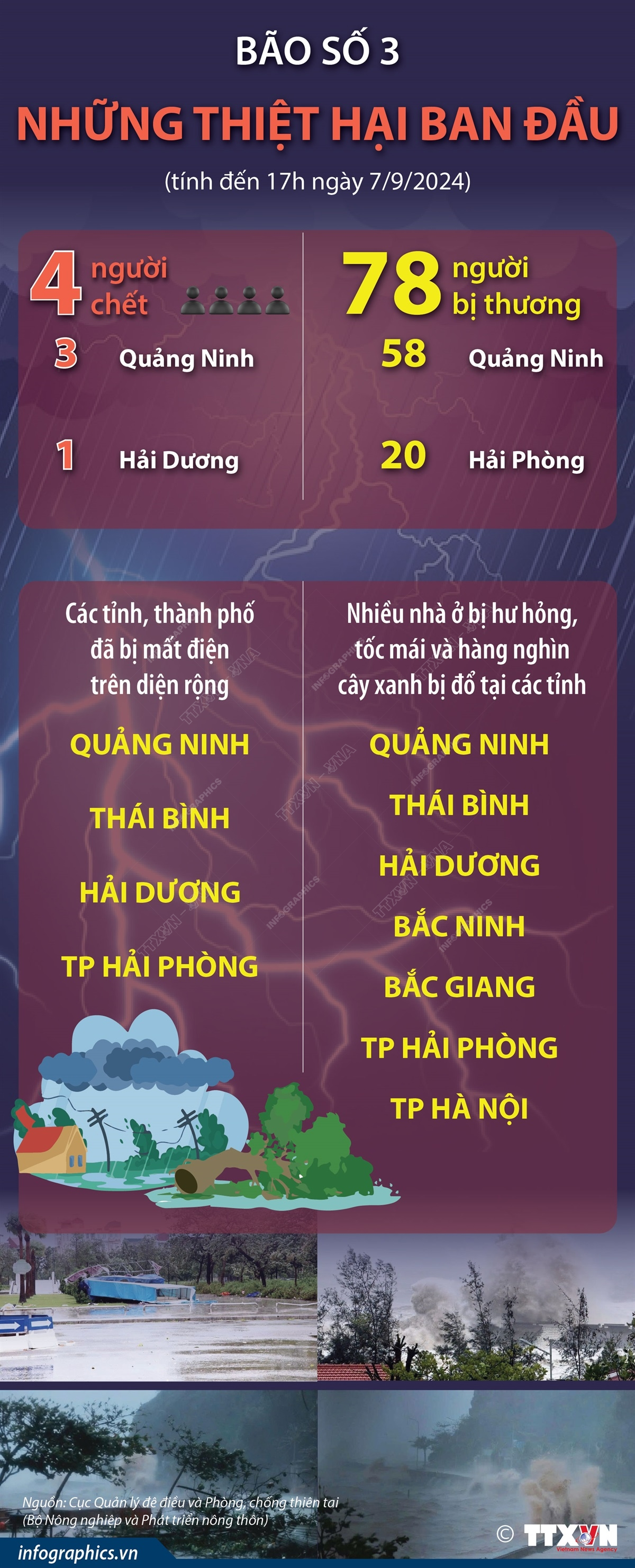 Theo thông tin từ Cục Quản lý đê điều và Phòng, chống thiên tai (Bộ Nông nghiệp và Phát triển nông thôn), tính đến 17h ngày 7/9, bão số 3 đã làm 4 người chết (Quảng Ninh 3 người, Hải Dương 1 người) và 78 người bị thương (Quảng Ninh 58 người, Hải Phòng 20 người). Về nhà ở và cây xanh, nhiều nhà ở bị hư hỏng, tốc mái và hàng nghìn cây xanh bị đổ tại các tỉnh: Quảng Ninh, Thái Bình, Hải Dương, Bắc Ninh, Bắc Giang và TP Hải Phòng, TP Hà Nội. Tại tỉnh Quảng Ninh, Thái Bình, Hải Dương và TP Hải Phòng đã bị mất điện trên diện rộng.
