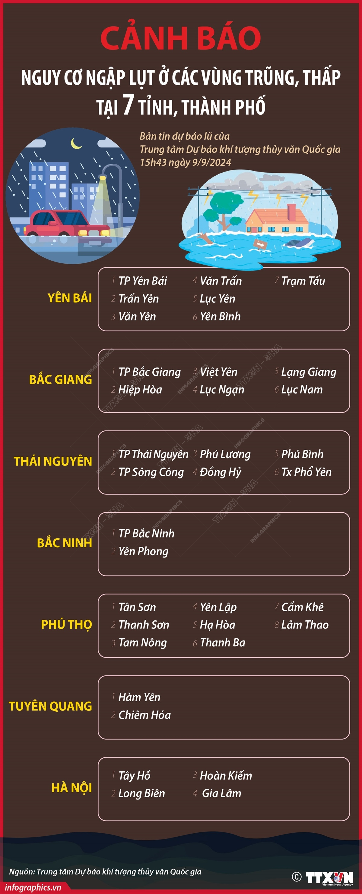 Theo Trung tâm Dự báo khí tượng thủy văn Quốc gia, trong những giờ tới, nguy cơ cao xảy ra ngập lụt tại các vùng trũng thấp ven sông tại các tỉnh, thành phố Yên Bái, Bắc Giang, Thái Nguyên, Bắc Ninh, Phú Thọ, Tuyên Quang và Hà Nội.
