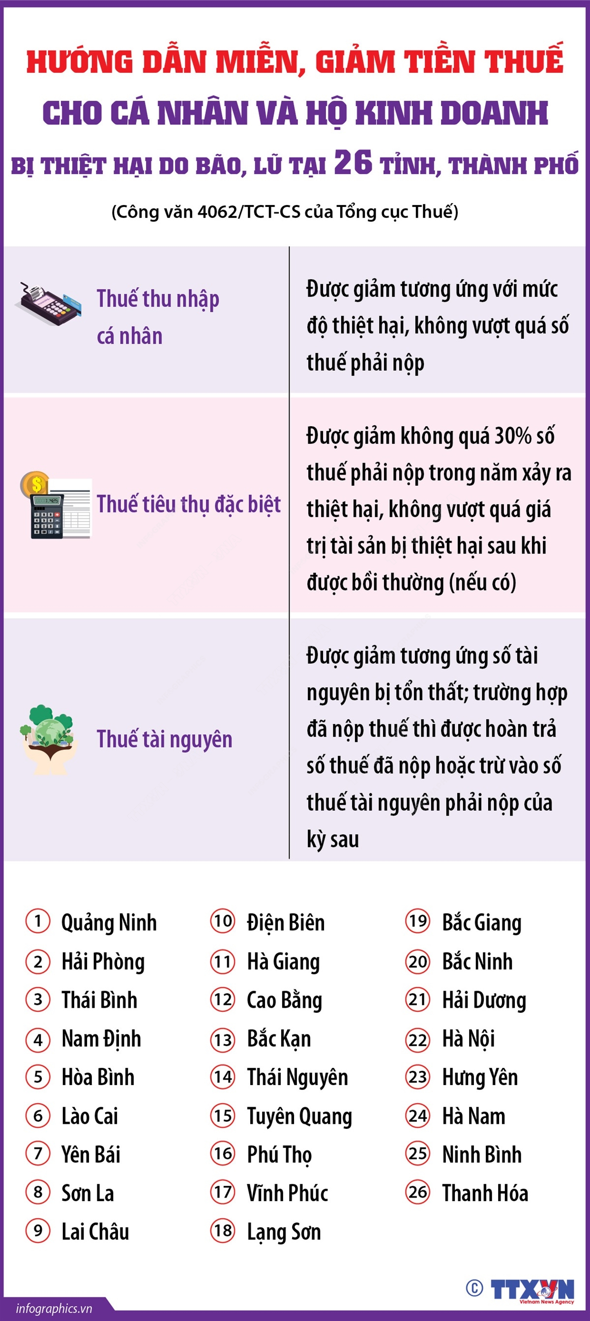 Tổng cục Thuế vừa có Công văn 4062/TCT-CS hướng dẫn giảm thuế cho người dân, doanh nghiệp sau bão lũ tại 26 tỉnh, thành phố: Quảng Ninh, Hải Phòng, Thái Bình, Nam Định, Hòa Bình, Lào Cai, Yên Bái, Sơn La, Lai Châu, Điện Biên, Hà Giang, Cao Bằng, Bắc Kạn, Thái Nguyên, Tuyên Quang, Phú Thọ, Vĩnh Phúc, Lạng Sơn, Bắc Giang, Bắc Ninh, Hải Dương, Hà Nội, Hưng Yên, Hà Nam, Ninh Bình và Thanh Hóa. Theo đó, các cá nhân và hộ kinh doanh bị thiệt hại do bão, lũ sẽ được giảm thuế thu nhập cá nhân, thuế tiêu thụ đặc biệt và thuế tài nguyên.